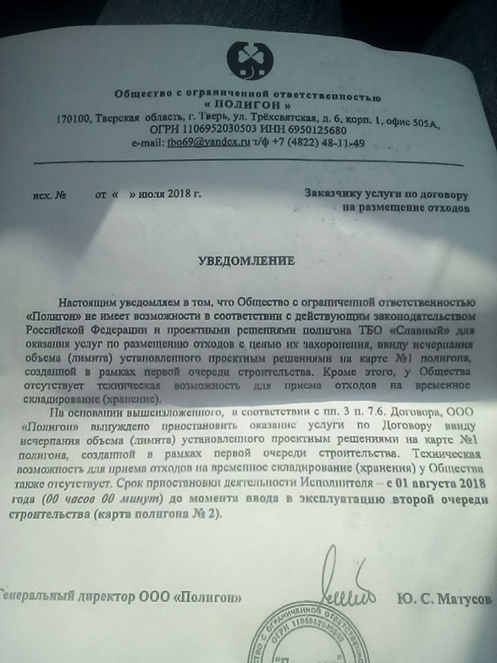В распоряжении «Тверь24» оказалось письмо за подписью генерального директора компании «Полигон» Юрия Матусова, в котором он уведомляет организаторов-заказчиков услуг на размещение мусорных отходов в Твери о том, что с 1 августа первая очередь полигона в Славном (куда стекается весь тверской мусор) перестает принимать отходы по причине переполненности свалки. Вторая очередь строительства полигона не ведётся, а уже сейчас, по словам Матусова, критически важна. Ресурс первой площадки исчерпан.
