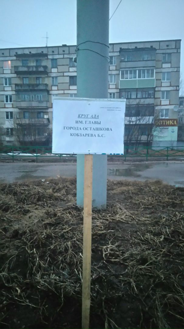 Первый такой участок — с именем главы Кобзарева — появился на участке кругового движения на пересечении улиц Загородная и Рудинская, а также Гвардейского проспекта. «Данному месту присвоено почётное название «Круг Ада им. Главы города Осташкова Кобзарева Б.С. Кто здесь ездит-тот поймёт» — пишут активисты.