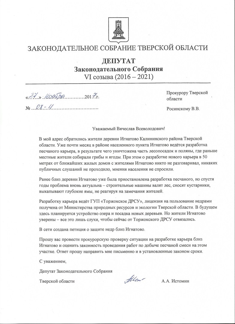 Зато есть реакция в Законодательном Собрании Тверской области — его депутат Андрей Истомин, к которому тоже обратились за справедливостью жители Игнатово, подготовил запрос по ситуации в Прокуратуру Тверской области. С его содержанием вы можете ознакомиться ниже: