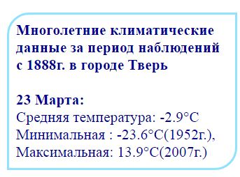 Над Тверской областью завис антициклон, который принес ясную погоду.Днем будет теплее, чем положено, а ночью небольшой мороз, причем впервые дни недели подморозит серьезно — от -7 до -13 градусов. Давление аномально высокое для нашей местности — 760-766 мм ртутного столба. Днем в понедельник, вторник и среду — +1, +8 градусов, к концу недели северный ветер сменится на южный, что приведет к тому, что днём метеорологи прогнозируют аж до +12 градусов. Это рекордная температура.