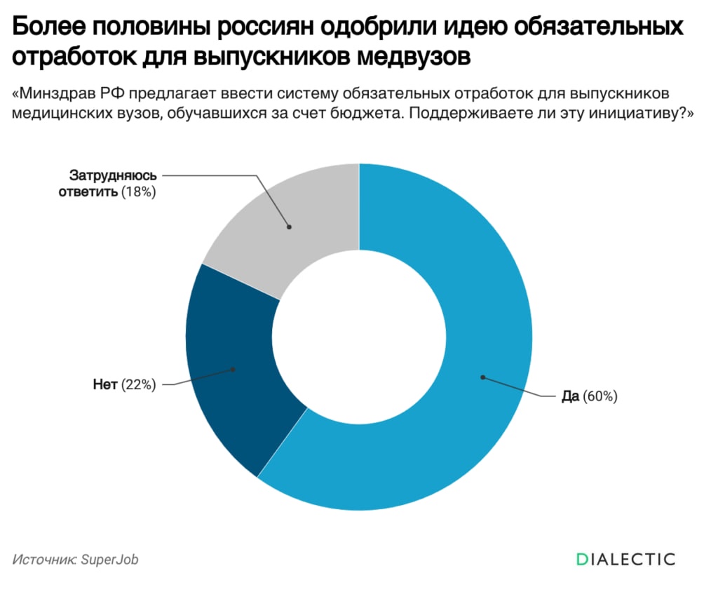 Хотя большинство жителей России одобряет идею обязательной отработки для выпускников медицинских вузов, вопрос о целесообразности штрафов остаётся открытым и вызывает значительные разногласия в обществе, указывает «Диалектик». На первый план выходит создание условий, обеспечивающих достойную оплату труда врачам и медицинскому персоналу, ориентированным на помощь пациентам, а не извлечение прибыли.
