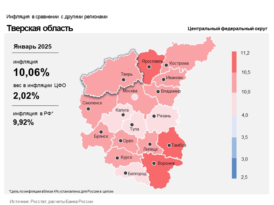 Годовая инфляция в Тверской области в январе 2025 года повысилась и составила 10,06% после 9,35% в предыдущем месяце. В Центральном федеральном округе и по России в целом годовая инфляция также увеличилась и составила 10,07% и 9,92% соответственно. На динамике годовой инфляции в регионе сказался рост издержек производителей и продавцов ряда товаров. Также были проиндексированы тарифы на отдельные услуги, проинформировал Банк России.