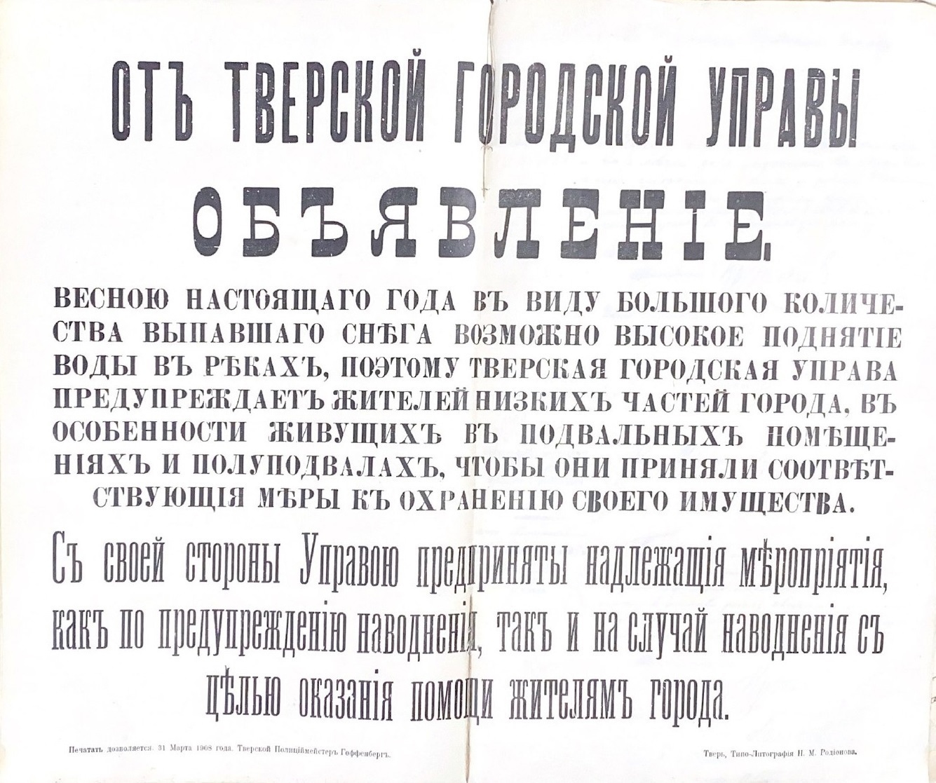 17 апреля 1908 г. тверской полицмейстер докладывал тверскому губернатору Н.Г. Бюнтингу: «… вскрытие рек в г. Твери сопровождалось сильным поднятием воды, уровень которой достигал 4,93 саж. и при этом некоторые наиболее низкие местности г. Твери были затоплены. По собранным ныне сведениям, наводнению подверглись: в I-й Городской части местность, где находятся бани Куровой, во 2-1 части: за Волгою местность по берегу р. Тверцы и за Тверцою – Набережная и улицы: Пленкина, Екатерининская, Матисова, Старо-Бежецкая и Исаевец; в 3-й части – часть набережной р. Волги, близ церкви Иоанна Предтечи; в 4-й части – Разгуляй по правую сторону шоссе к станции и огороды по левую сторону, и часть двора ф. Берга с некоторыми строениями; в I-м фабричном участке – местность по берегу р. Волги и Красная слободка. Всего затопленных домов 332, пострадавших от наводнения лиц до 1000 человек. Убыток исчисляется суммою до 30000 руб. …»