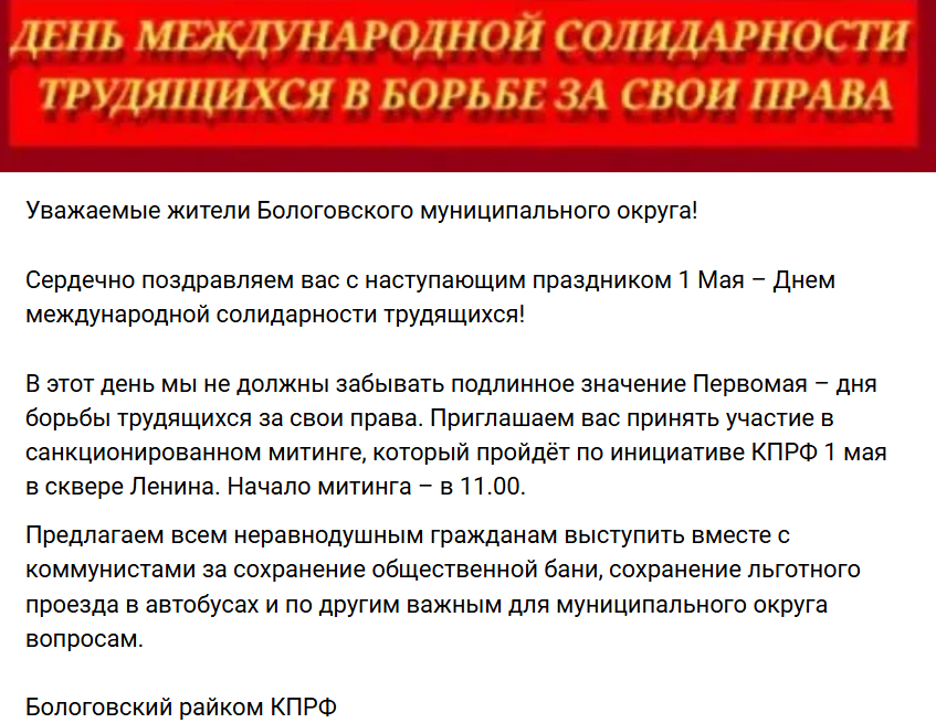 Звучит обнадеживающе, но, как считают бологовские коммунисты, расслаблять не стоит. К слову, местное отделение КПРФ готовится 1 мая провести в городе митинг. Одним из ключевых тем для обсуждения будет ситуация, связанная с общественной баней.
