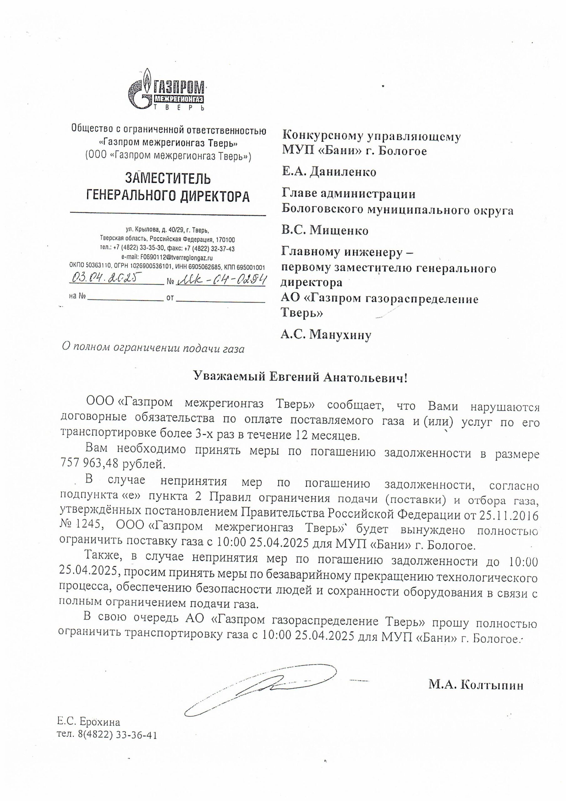 Но вернемся в Бологое. В последние пару месяцев ситуация с местной баней достигла апогея. Из ООО «Газпром межрегионгаз Тверь» в адрес конкурсного управляющего МУП «Бани», а также в адрес и. о. Главы Бологовского района Владимира Мищенко пришло грозное письмо. Газовщики требовали погасить до 25 апреля долг в сумме 757 963,48 рублей. В противном случае, 25 апреля 2025 года городскую баню грозились отключить от газа.