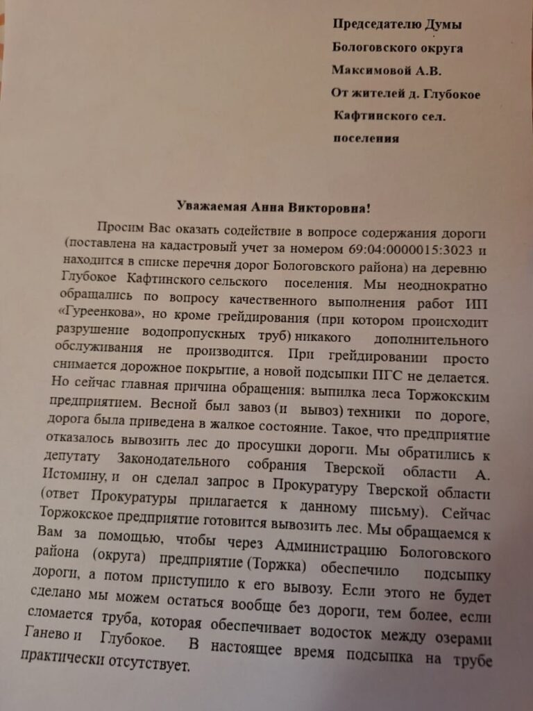 Жители Кафтинского сельского поселения, в состав которого входит деревня Глубокое, неоднократно направляли жалобы в адрес власти в связи с тем, что сельские дороги нещадно разбиваются лесовозами.