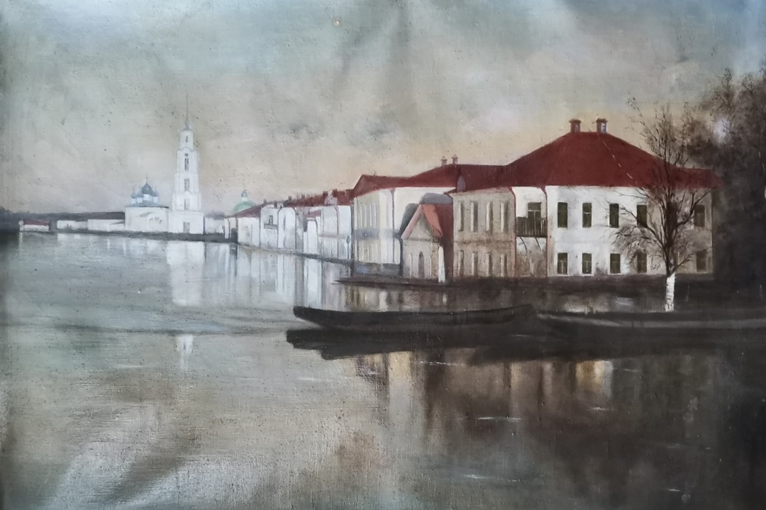 На картине А. Суворова мы видим весенний разлив Волги. Набережная 2-й части города напоминает Венецию. Купеческие дома окружены водой. Лодки на переднем плане картины подсказывают зрителю, как калязинцы справляются с обрушившимся на них половодьем. До строительства Угличской плотины такие ситуации не были редкостью в нашем городе. Калязинцы были готовы к тому, что по весне Волга может подтопить дома и пешую прогулку вполне может заменить прогулка на лодке. На заднем плане картины — Николаевский собор и колокольня. Старинный город живёт обычной жизнью. Большая вода пока ещё не является большой бедой.