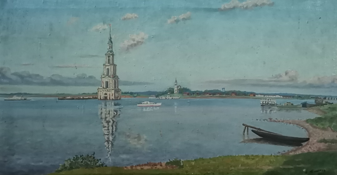 Картина В. Божикова показывает нам совсем иной Калязин. После строительства Угличской ГЭС и плотины Калязин больше никогда не подтапливало. Город оказался затопленным на две трети. Были безвозвратно утрачены набережная с купеческими особняками, Николаевский собор, храм Иоанна Предтечи, торговая площадь. И только колокольня, оставленная в водохранилище в качестве навигационного знака, величественно выступает из волжских вод.