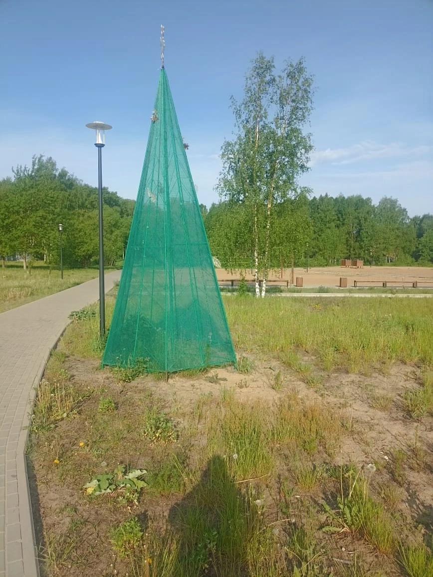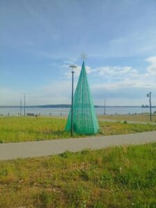 Прогуливаясь по новой, благоустроенной набережной города Калязин, туристы неожиданно натыкаются на неожиданную для конца мая инсталляцию: новогоднюю декорацию в виде наряженной новогодней ёлки, выполненной из стального сварного конусообразного каркаса, обтянутого сетчатой тканью характерного зелёного цвета, частично украшенную новогодними игрушками и увенчанную большой снежинкой.