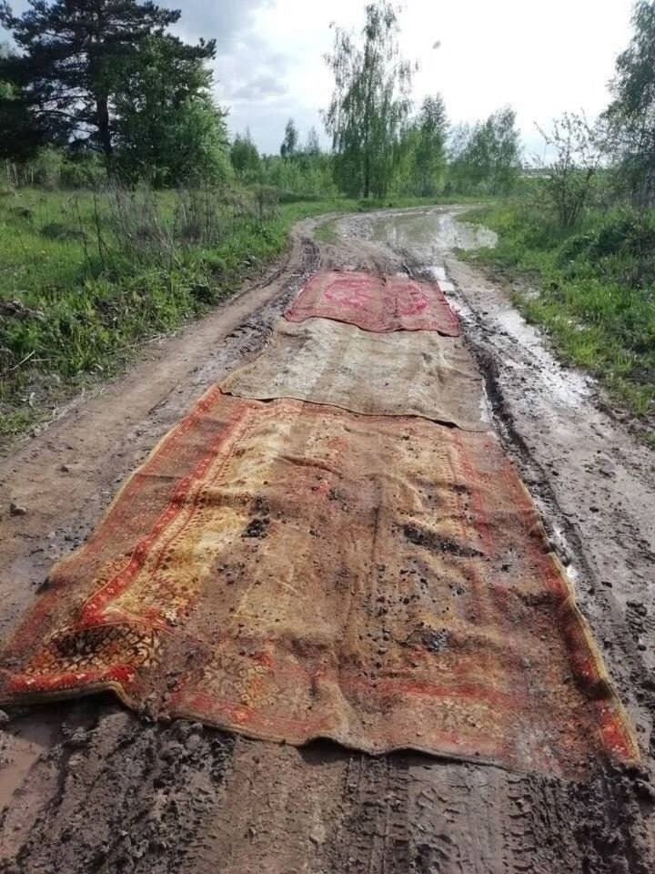 Возможно, столь необычным способом граждане пытаются привлечь к проблеме внимание властей. А что, застелить коврами дорогу в надежде на приезд губернатора Рудени — это мысль!