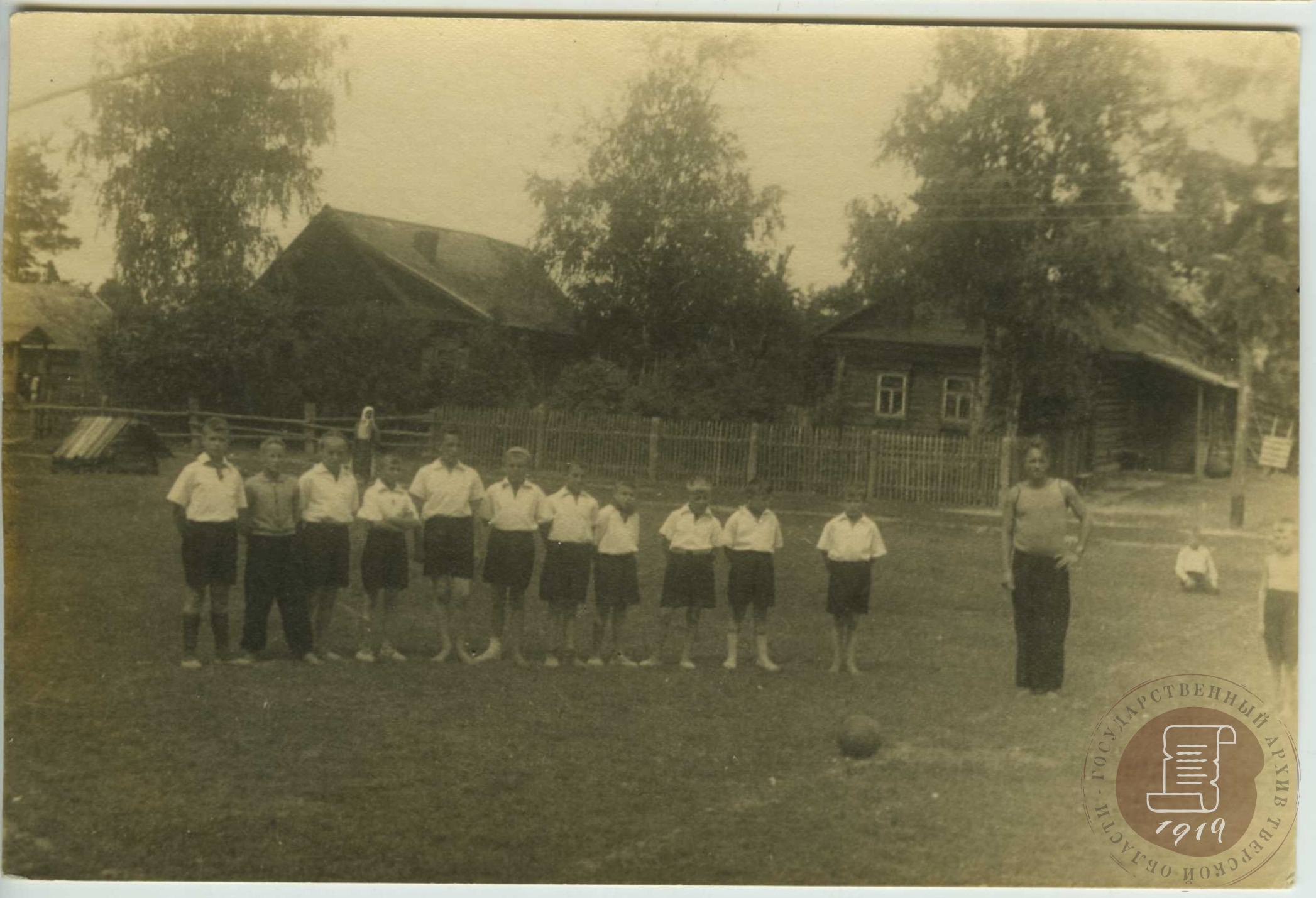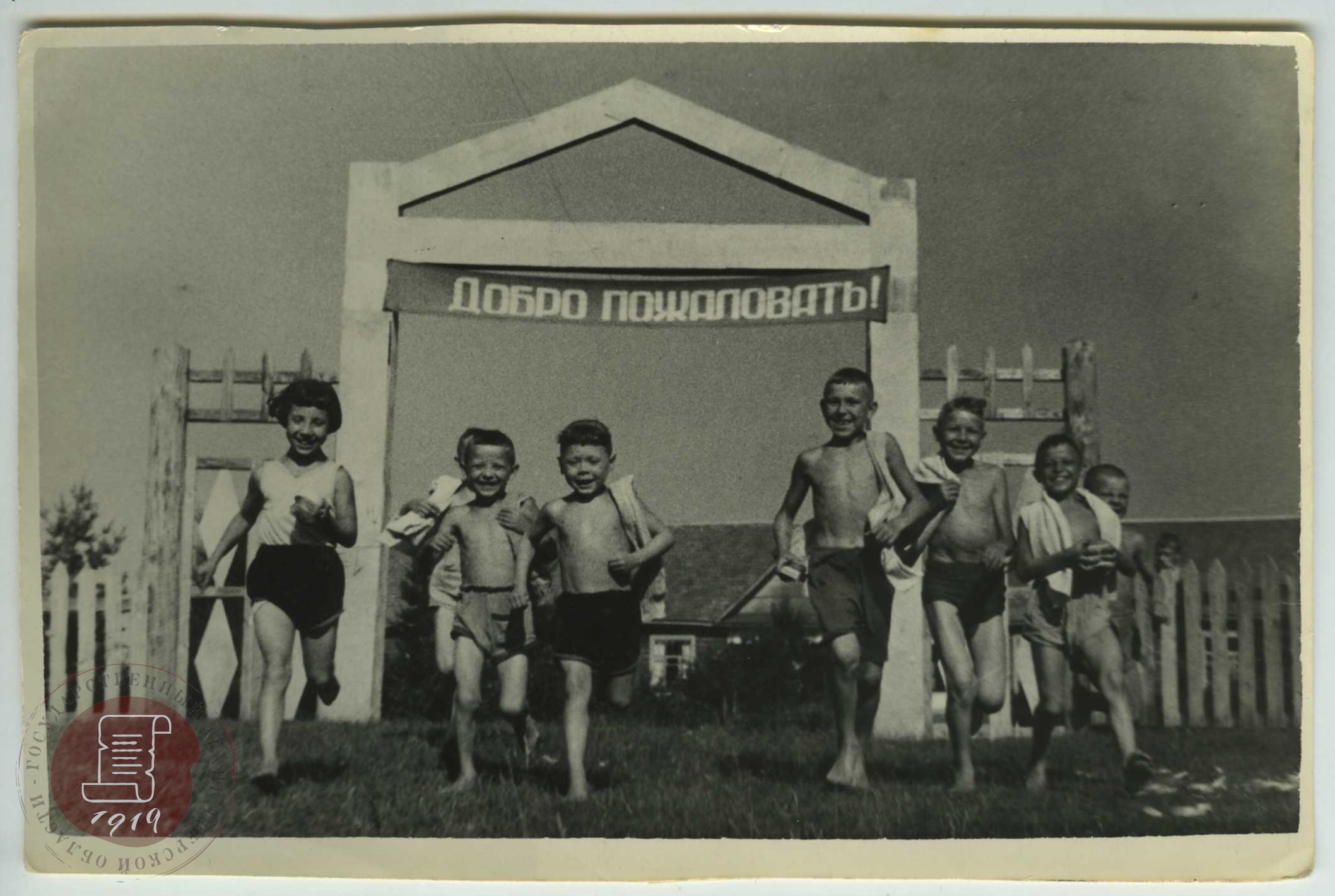 — Встреча пионеров лагеря хлопчатобумажного комбината «Пролетарка» с пионерами лагеря Госторговли. Дер. Протасово. Б.д. // ГАТО. Ф. Р-2136. Оп. 1. Д. 1050. Л. 31;