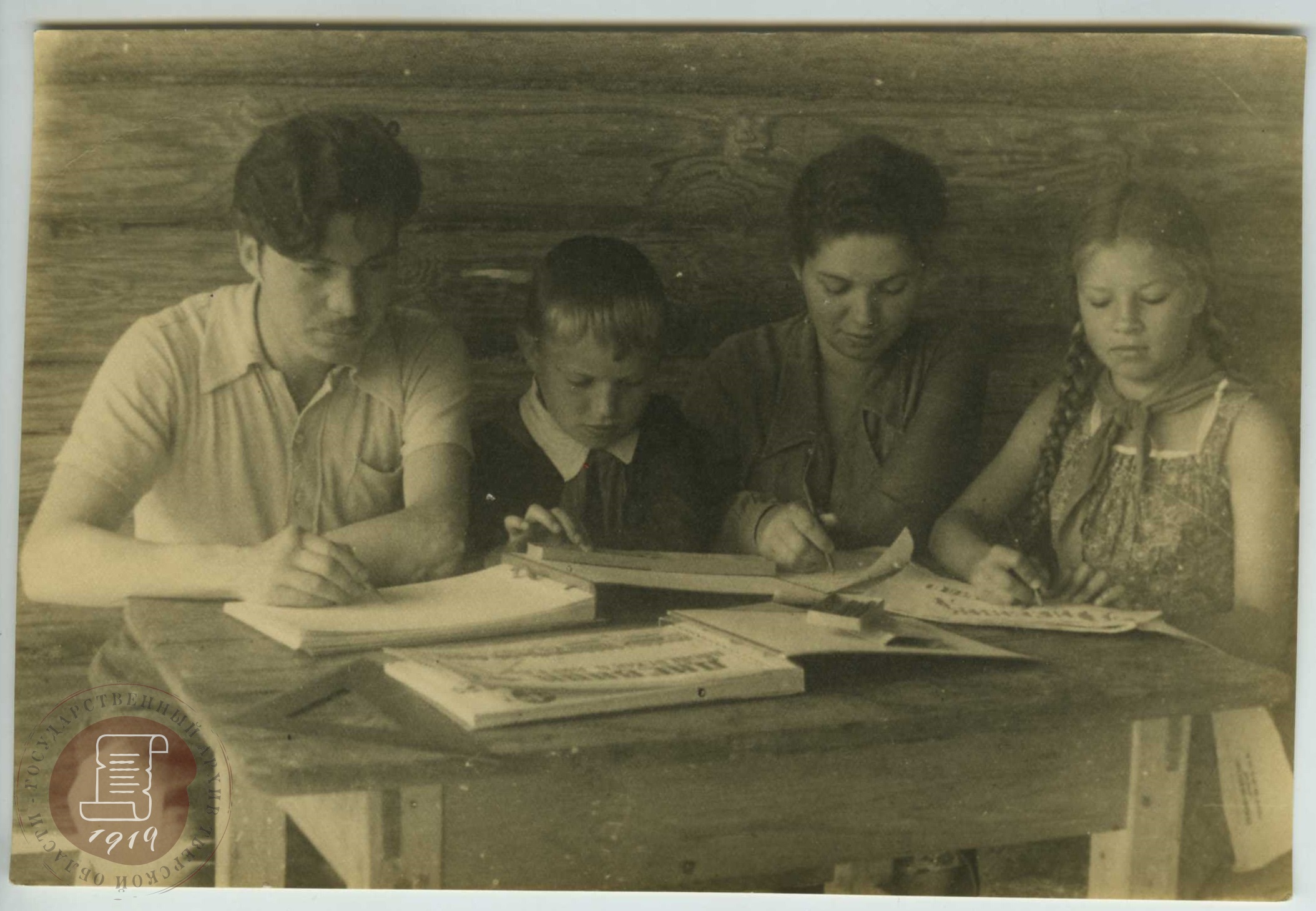 — Пионеры 4-го отряда лагеря ткацкой фабрики хлопчатобумажного комбината слушают рассказы о подвигах героев Великой Отечественной войны. Читает воспитатель Ираида Павловна Павлова. Б.д. // ГАТО. Ф. Р-2136. Оп. 1. Д. 1050. Л. 58.