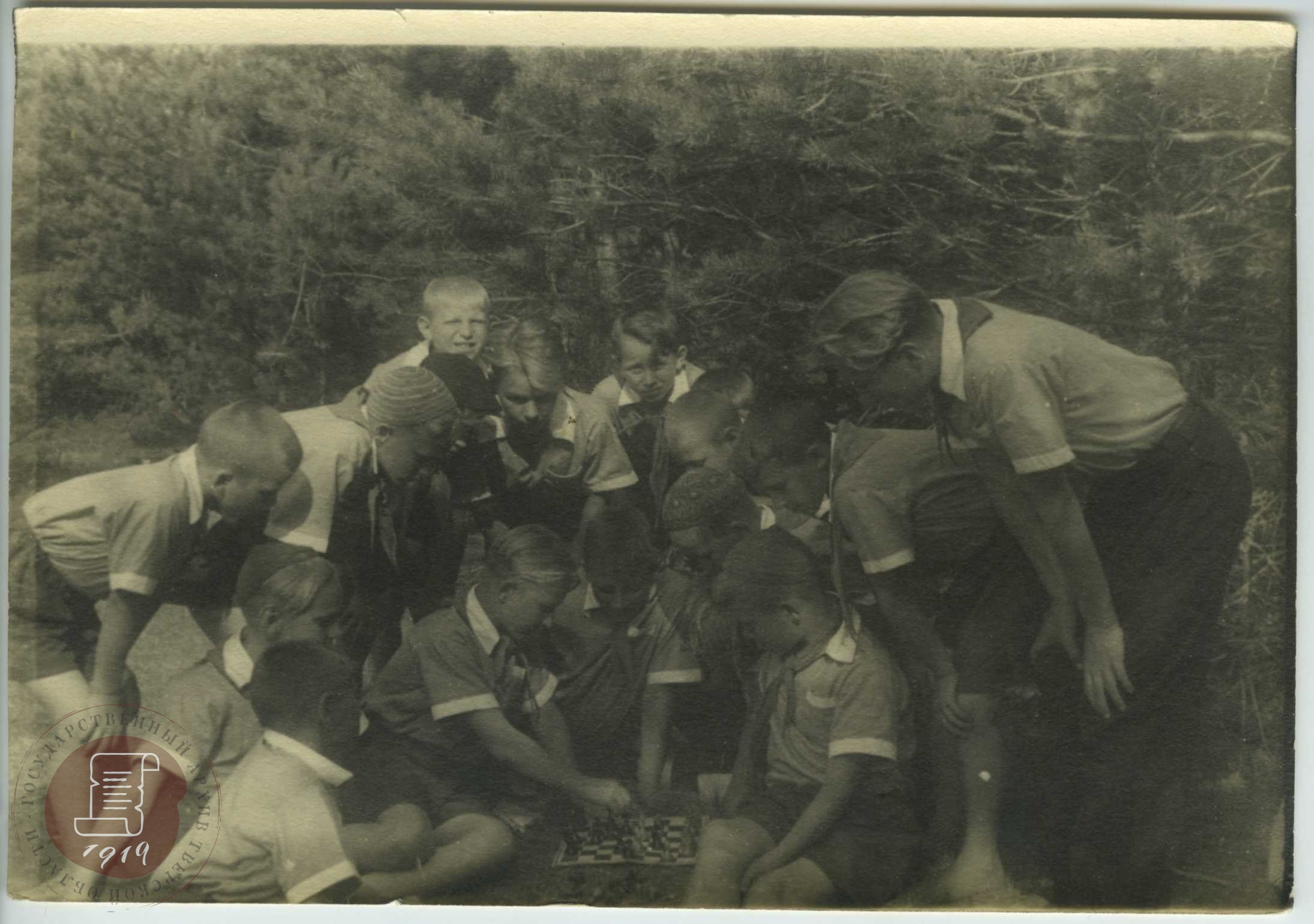 — «Кто, кого?». Игра в шахматы в пионерском лагере. Б.д. // ГАТО. Ф. Р-2136. Оп. 1. Д. 1050. Л. 34;
