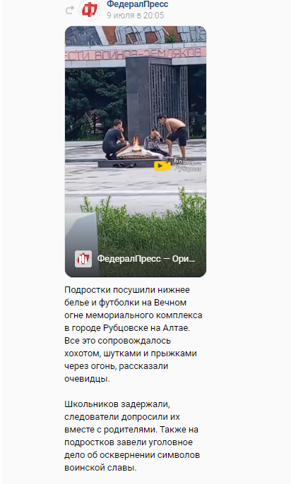 К слову, «шутки» с Вечным огнём могут иметь для подростков очень серьезные последствия, вплоть до уголовного дела за осквернение символов воинской славы. Подобные прецеденты в России уже есть.