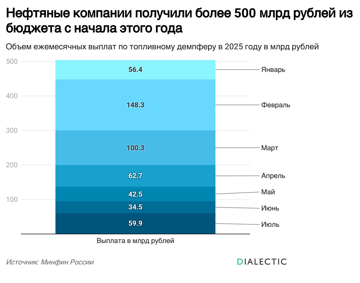 Отечественные нефтяные компании получили почти 60 млрд рублей по механизму топливного демпфера в июле этого года, пишет «Диалектик». Механизм демпфера предназначен для стабилизации роста цен на топливо внутри России. Выплаты нефтяным компаниям производятся, когда цена на зарубежных рынках превышает внутрироссийские цены.