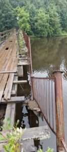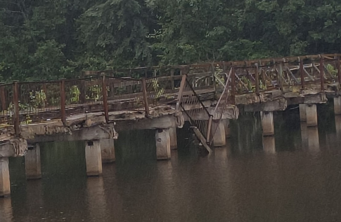 На фото, размещённых в группе ВК «Подслушано Нелидово», отчетливо видно, что часть конструкций моста обвалилась в речку. Ограждение моста (старые, ржавые перила) повреждено, а местами отсутствует.