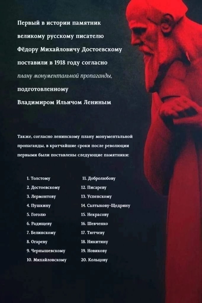 Итак, начнём с «запрещённого» большевиками Фёдора Михайловича Достоевского. Мало кто знает, что первый в мире памятник Достоевскому был поставлен… в 1918 году в Москве. Да-да, в 1918 году, уже во времена «запрещавшей» писателя Советской власти. Инициатором установки памятника был не кто иной, как Владимир Ильич Ленин. Сразу после Великого Октября Владимир Ильич собственноручно подготовил план монументальной пропаганды. Вождь большевиков не без оснований полагал, что для построения социалистического общества необходимы культурные, грамотные и образованные люди, и, несмотря на разгоравшуюся Гражданскую войну и царящую в стране разруху, большевики стали вкладывать силы и средства в «такую чепуху» как культура. Вот составленный лично Лениным список деятелей культуры, которым предполагалось в кратчайшие сроки установить памятники: