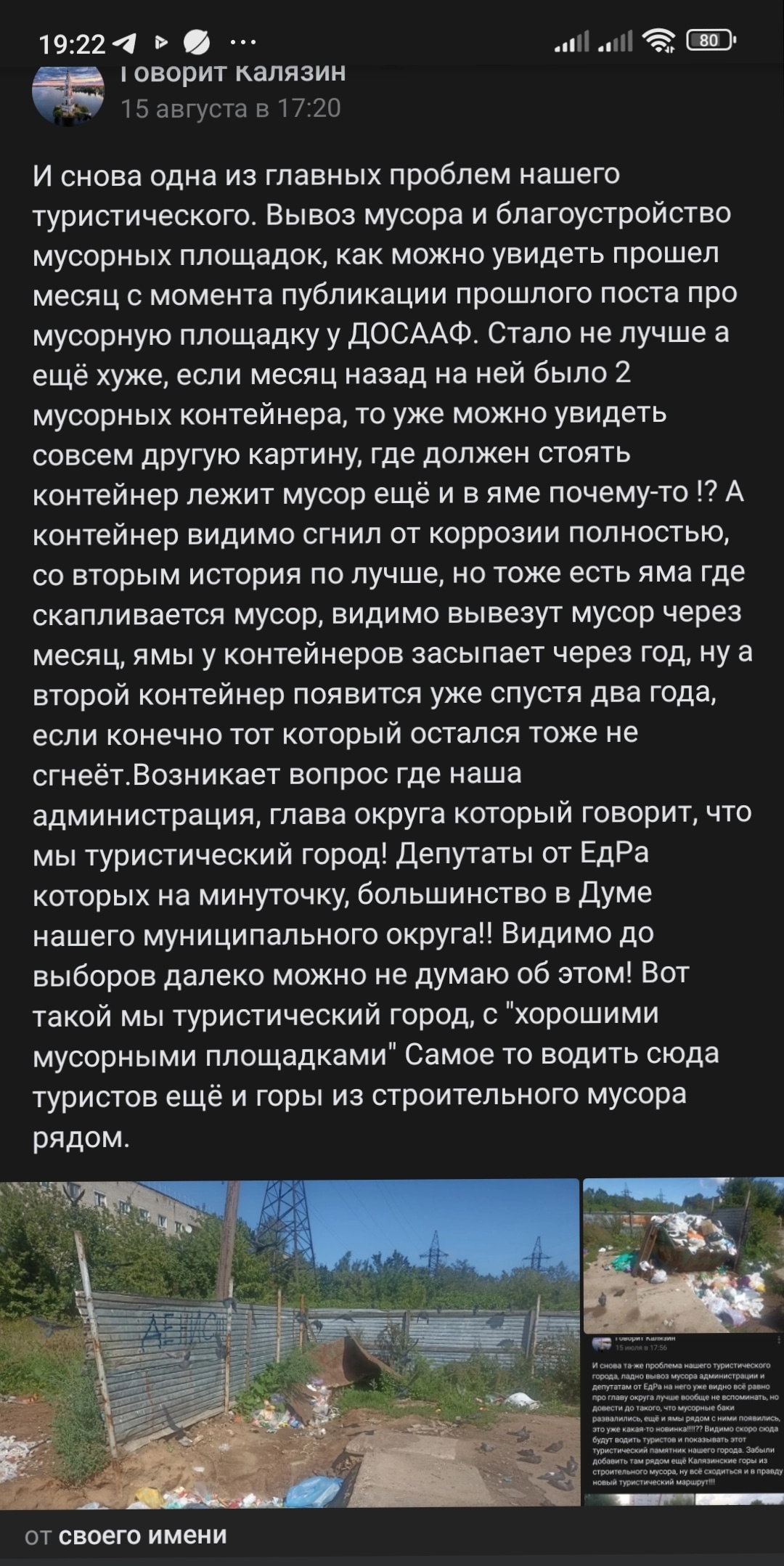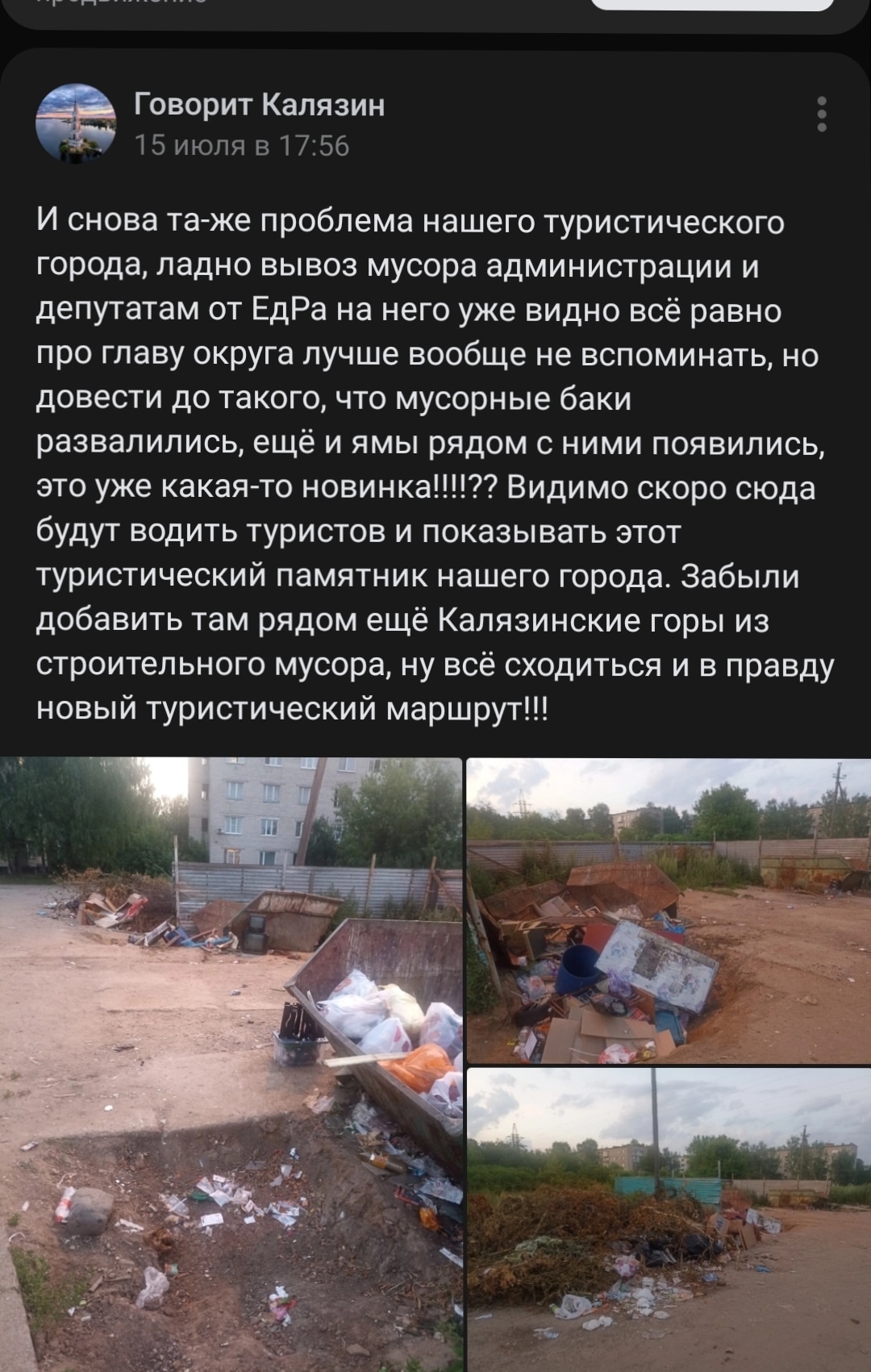 «Прошло три месяца с момента первой публикации нашего поста про данную мусорную площадку у ДОСААФ. Как можно увидеть результата ноль! Видимо администрации, главе округа и депутатам от ЕдРа не чего не нужно! Это просто позор!!! Реакции ноль!», возмущается автор поста в группе ВК «Говорит Калязин».