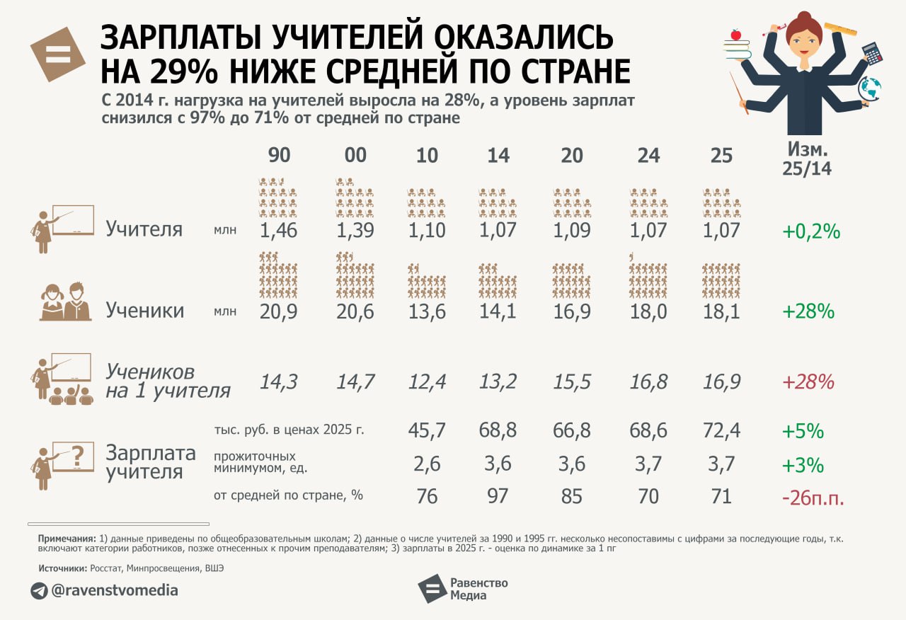 Подсчет через прожиточный минимум (ПМ) показывает столь же скромные результаты. Если в 2014 г. зарплата учителей была 3,63 ПМ, то в 2025 г. – 3,72, лишь на 3% больше.