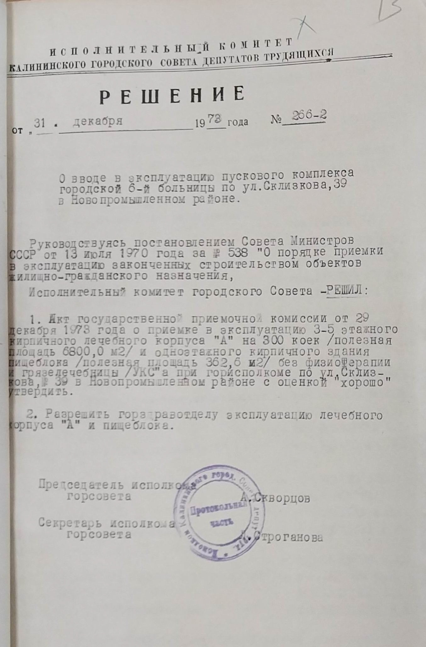 31 декабря 1973 года исполком Калининского горсовета разрешил горздравотделу эксплуатацию нового лечебного корпуса.