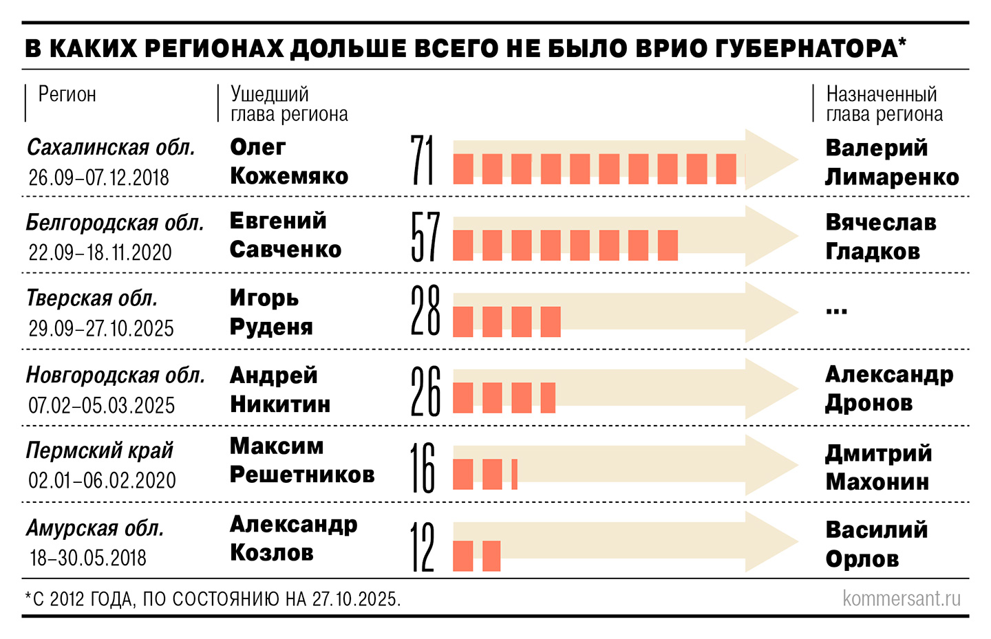 Похожая заминка с назначением врио губернатора произошла в феврале, когда руководивший Новгородской областью Андрей Никитин стал заместителем министра транспорта. Указ о его сменщике, которым в итоге оказался первый вице-губернатор Александр Дронов, был подписан президентом спустя 26 дней (см. график).