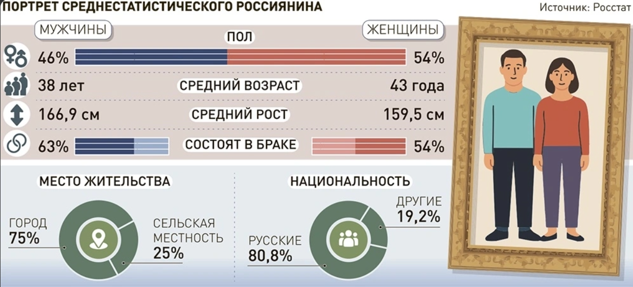 Росстат ко Всемирному дню статистики по просьбе РБК привел статистический «портрет» среднего россиянина (по данным статслужбы за 2024 год).