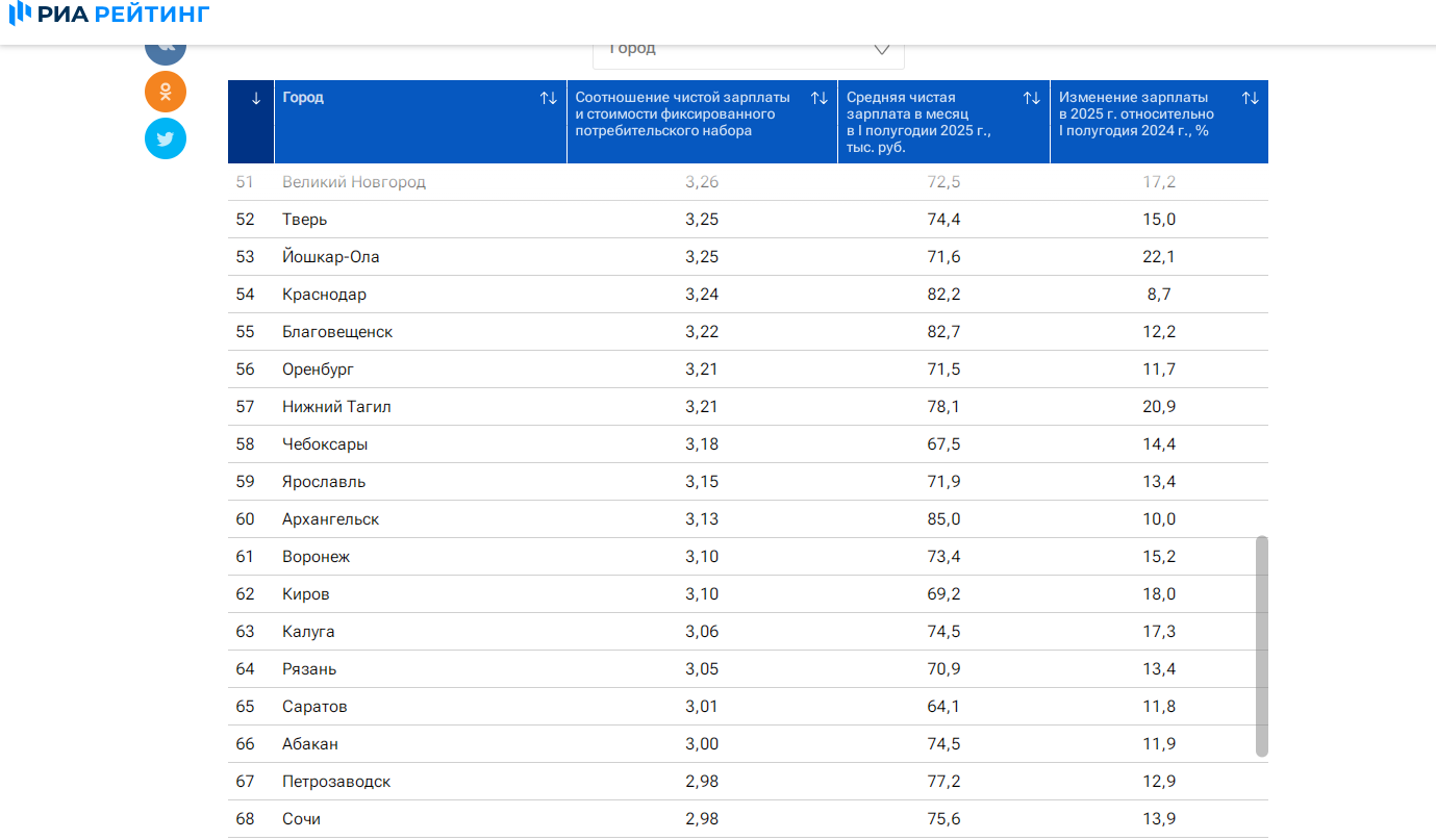 Первое место в рейтинге среди исследованных городов по покупательной способности средней зарплаты четвертый год подряд занимает Новый Уренгой. В этом крупнейшем городе Ямало-Ненецкого автономного округа чистая зарплата превышает стоимость фиксированного набора в 5,86 раза. Вторую строчку по покупательской способности заплаты заняла столица Ямала – Салехард, здесь средняя зарплата позволяет приобрести 5,57 фиксированных наборов товаров и услуг. На третью строчку переместился Южно-Сахалинск, где средняя чистая зарплата эквивалентна 5,25 фиксированного набора товаров и услуг.