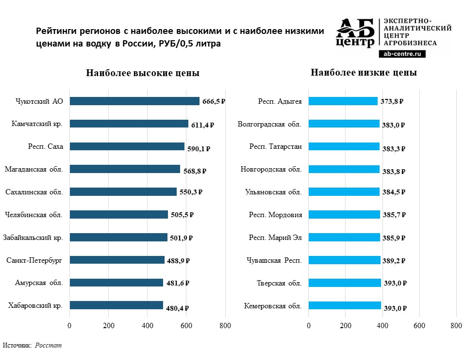 Самая дорогая водка в регионах — на Чукотке (666,5 руб.), Камчатке (611,4 руб.) и в Республике Саха (590,1 руб.).