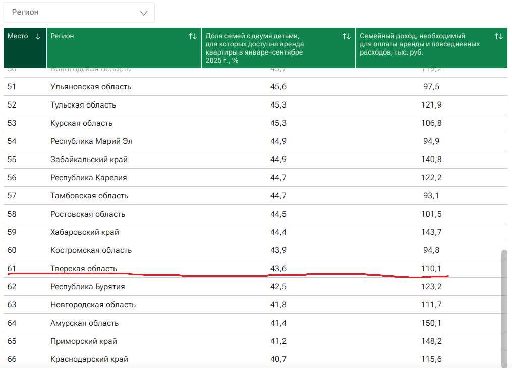 Такие данные приведены в рейтинге российских регионов по доступности аренды за январь-сентябрь 2025 года, который недавно опубликовало РИА Новости. Верхневолжье в этом списке оказалось на 61-м месте.