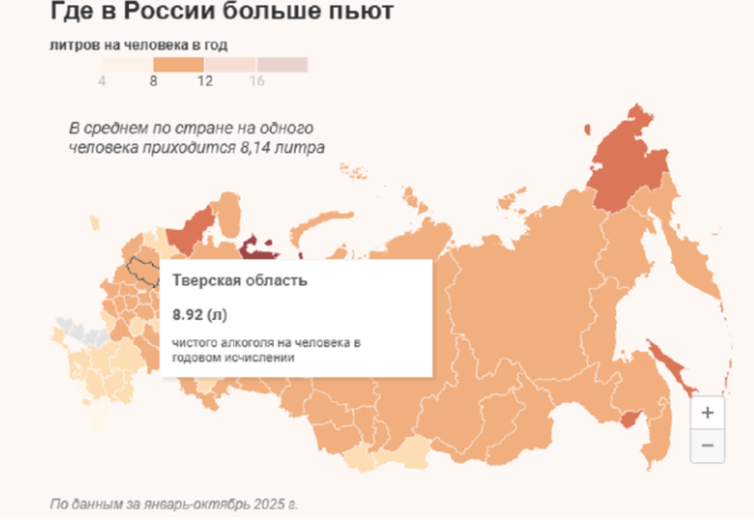 Среднестатистический житель Тверской области выпивает около 9 литров алкоголя в год. Это немного выше среднего показателя по России.
