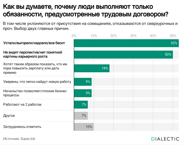 Согласно последнему исследованию портала SuperJob, на выгорание как основную причину такого поведения указали 53% опрошенных участников рынка труда.