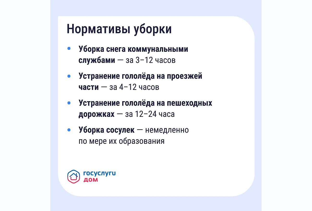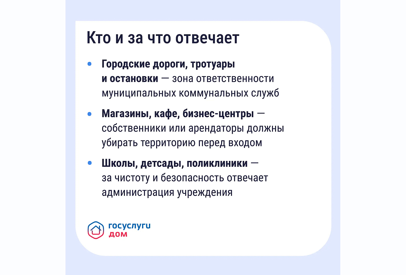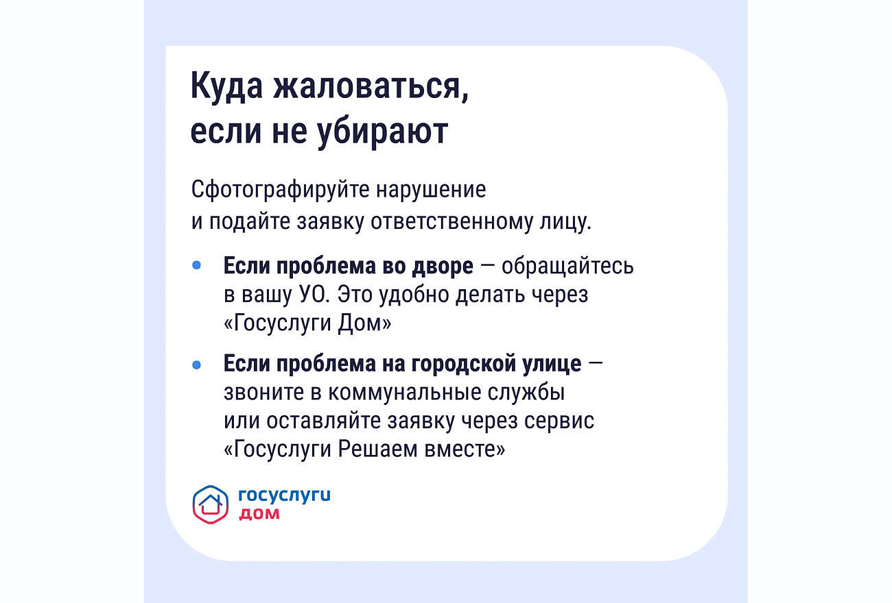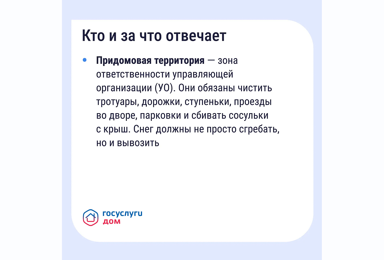 Придомовая территория – зона ответственности управляющей организации, которая обязана чистить тротуары, дорожки, ступеньки, проезды во дворе, парковки, очищать крыши от сосулек. Если уборка не была произведена вовремя, жильцы могут сфотографировать нарушение и подать заявку ответственному лицу через «Госуслуги.Дом».