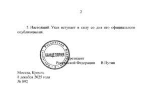 8 декабря Президент РФ Владимир Путин подписал указ о проведении в 2026 году военных сборов граждан, находящихся в запасе. Документ опубликован на официальном портале правовых актов. Ответственным за реализацию указанных мероприятий назначены Правительство Российской Федерации и соответствующие органы исполнительной власти.