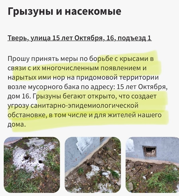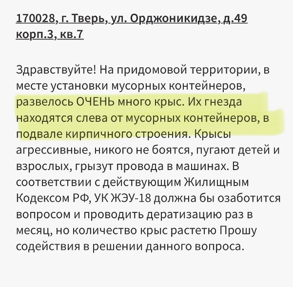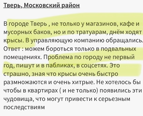 Как свидетельствует автор поста, нашествие грызунов (которые могут быть разносчиками опасных инфекций) особенно заметно в Центральном и Московском районах областной столицы. По наблюдению тверичан, системная борьба с вредными грызунами отсутствует напрочь. Крыс полно на Капошвара, пр-те Победы, ул. Орджоникидзе, ул, Склизкова, Фадеева, Попова, у гостиницы «Волга», и там, где старый жилой фонд и где новостройки. Имеется целая коллекция отписок за несколько лет, а крысы живут припеваючи, плодятся и множатся…