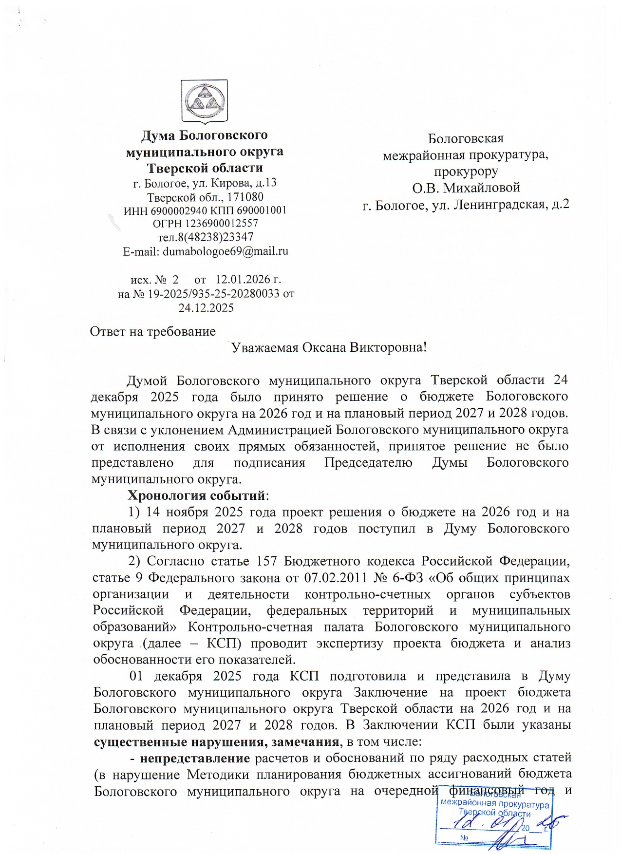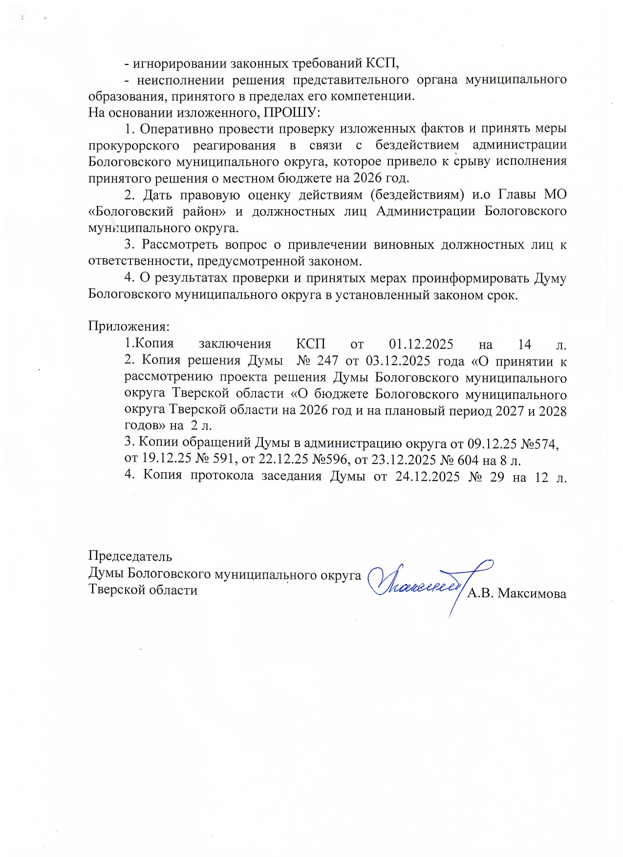 12 января текущего года председатель Бологовской думы Анна Максимова направила письмо в Бологовскую межрайонную прокуратуру, Следственный комитет и генпрокурору с подробным описанием сложившейся ситуации в Бологовском муниципальном округе.