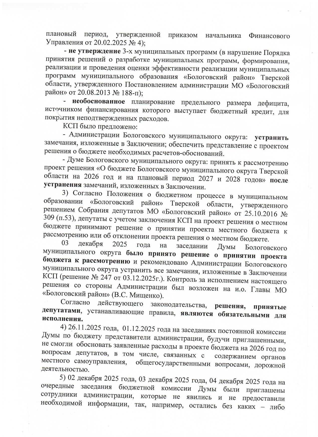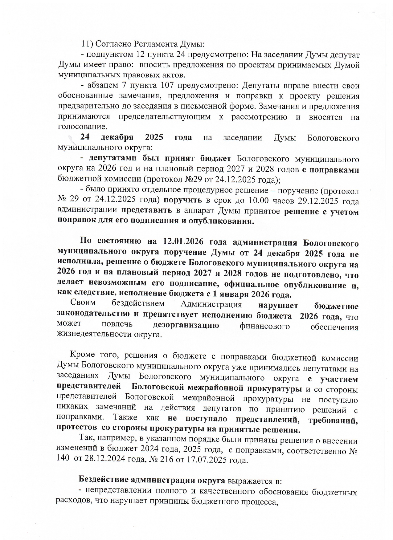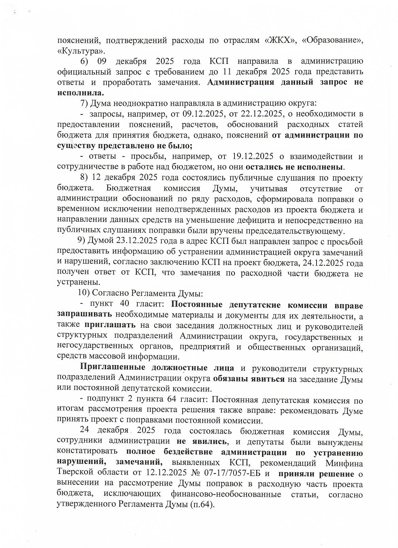 Администрация решила, что такой бюджет она исполнять не собирается и 30.12.2025 г. выпустила постановление о временном управлении бюджетом Бологовского муниципального округа, где и. о. главы Мищенко В.С. возложил на себя ответственность, став единоличным контролёром окружного бюджета.