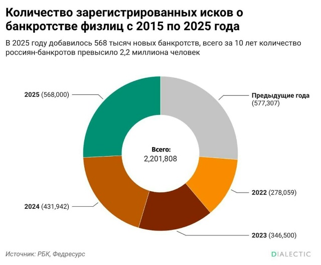 С момента введения института банкротства в 2015 году общее число несостоятельных граждан в России преодолело знаковую отметку в 2,2 миллиона, пишет «Диалектик».