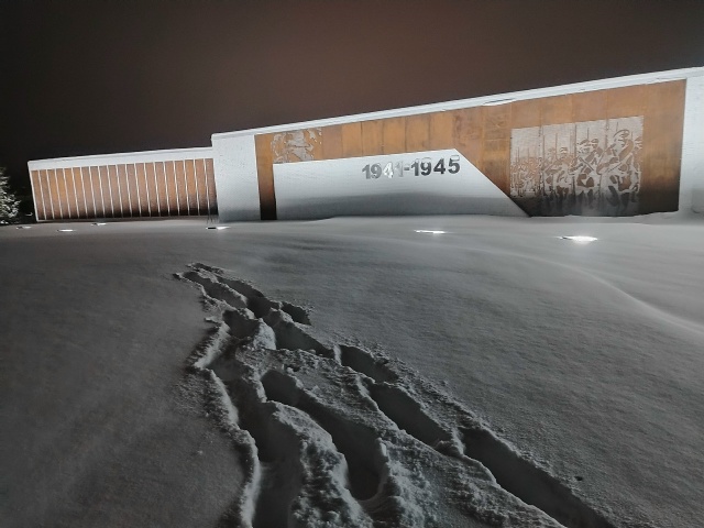 Мы съездили в Парк Мира. Да, девственно-нетронутая снежная гладь высотой местами выше колена покрывает всю площадь советского воинского кладбища. В задней части виднеются несколько фонариков, видимо после недавнего ремонта. Справа новое строение…