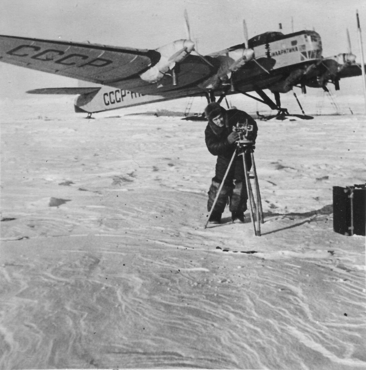 Участник высокоширотной экспедиции самолета «СССР Н-169» производит научные наблюдения на льдине №1. 4 мая 1941 г.