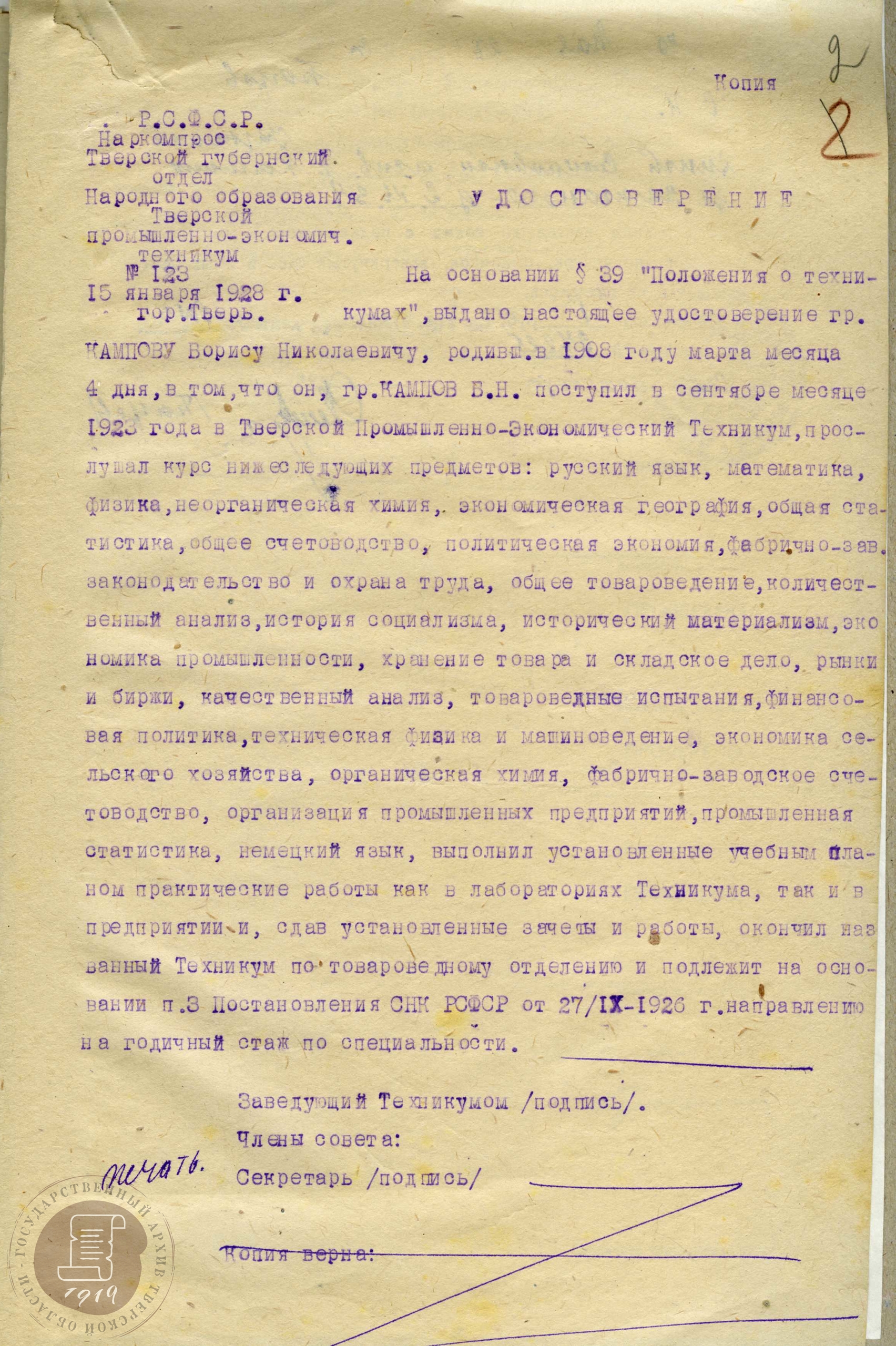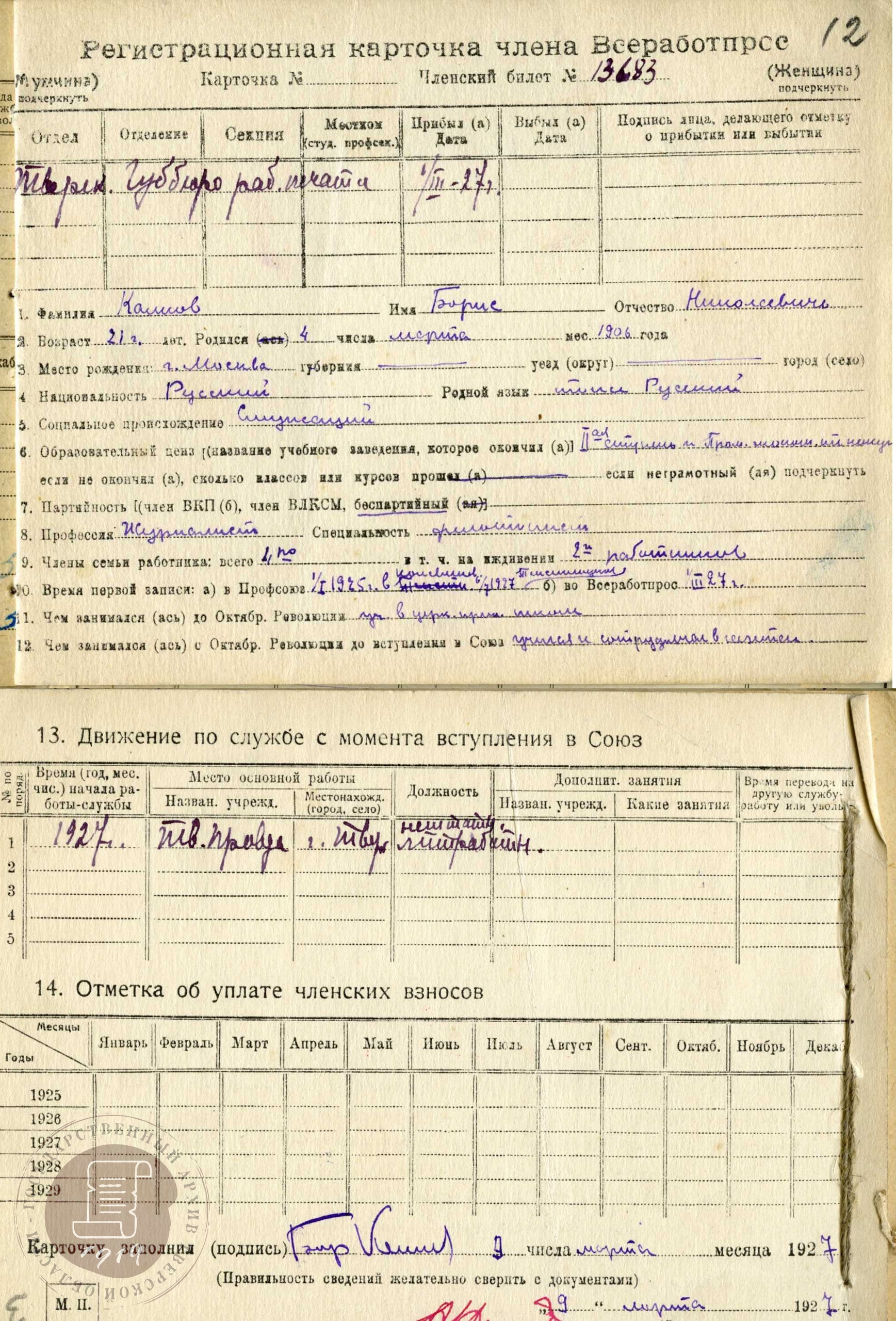 — Регистрационная карточка члена профсоюза работников просвещения Б.Н. Кампова. 1927 г. // ГАТО. Ф. Р-501. Оп. 1. Д. 474. Лл. 12-12 об.