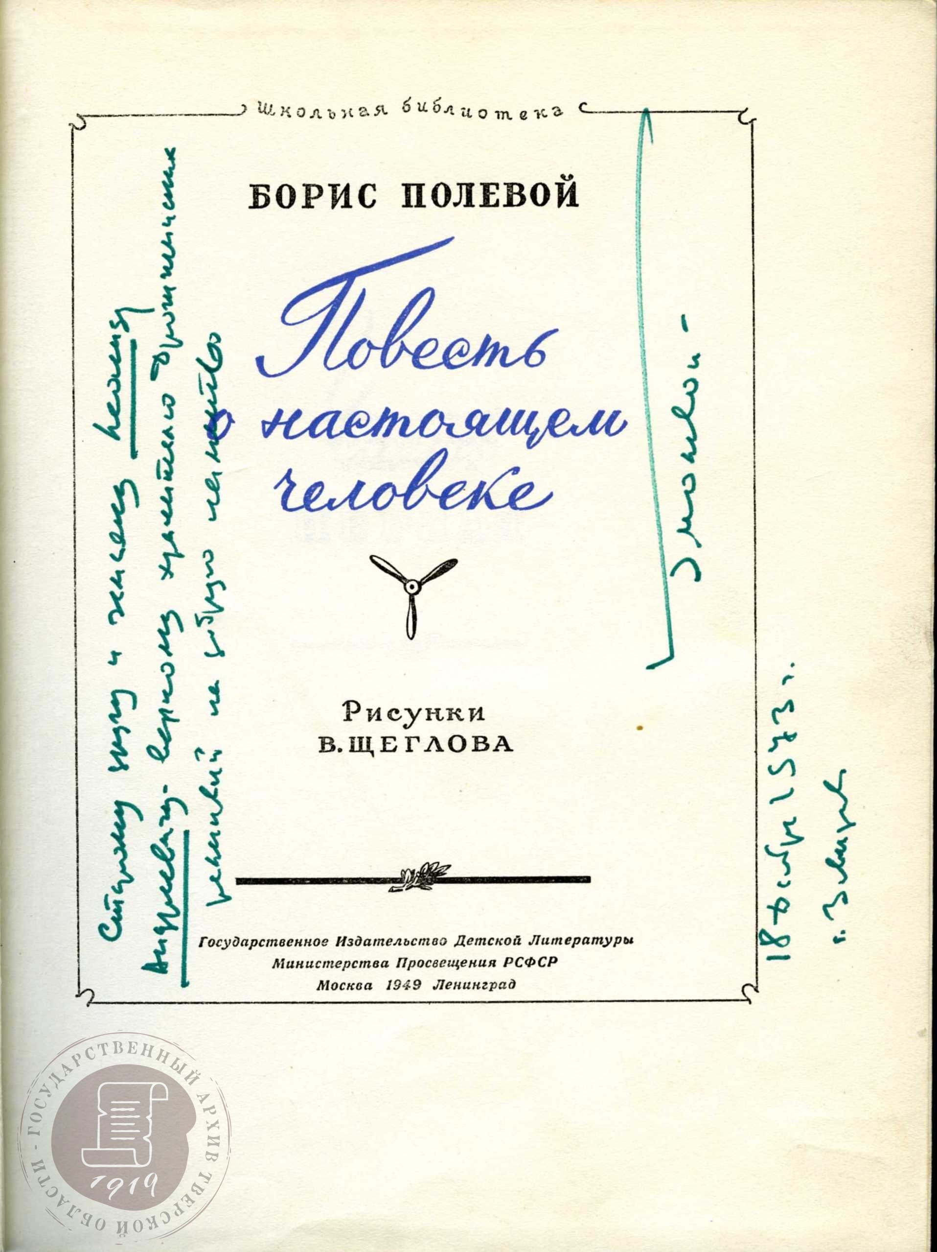 — Экземпляр Повести о настоящем человеке с личной подписью Б.Н. Полевого. 1973 г. // ГАТО. Ф. Р-2792. Оп. 1. Д. 98.