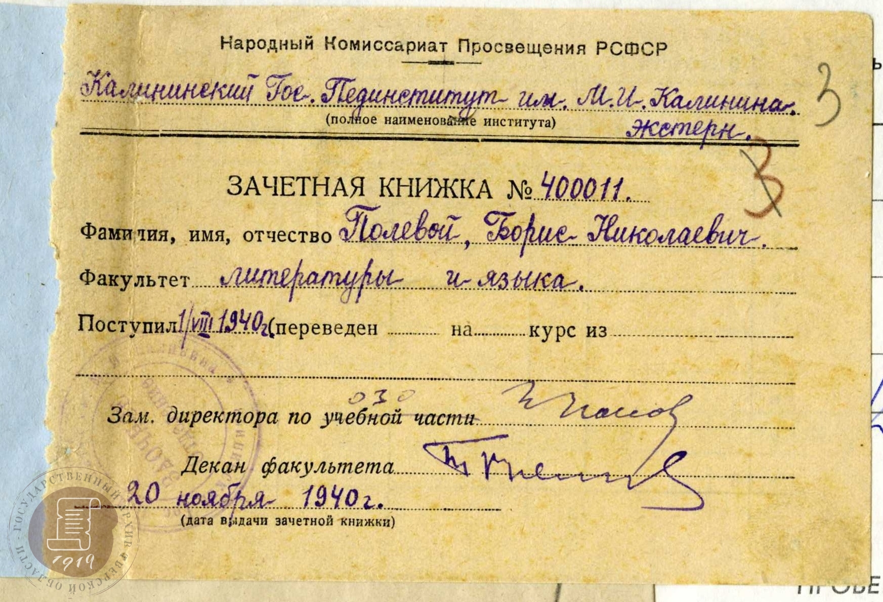 — Личное дело писателя Б.Н. Полевого, студента Калининского государственного педагогического института. 1940 г. // ГАТО. Ф. Р-1213. Оп. 45. Д. 600. Лл. 1-5.