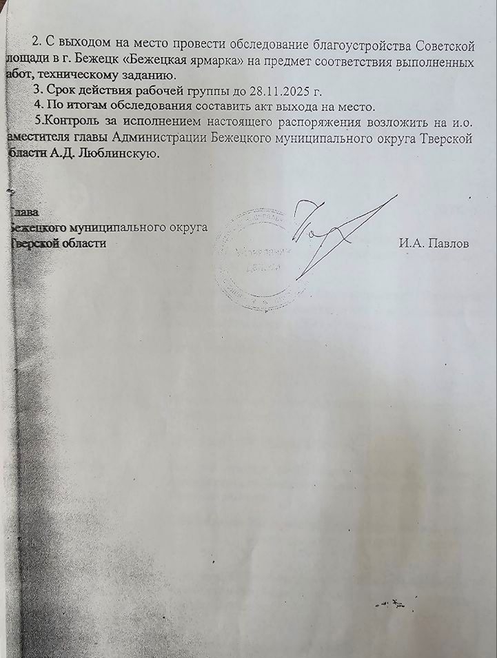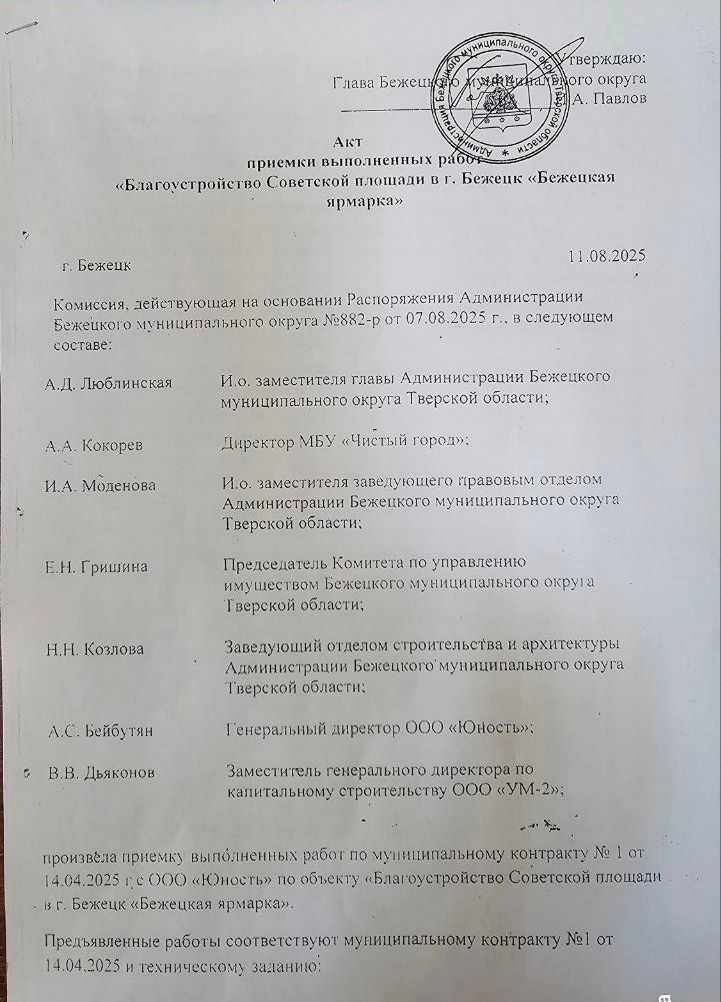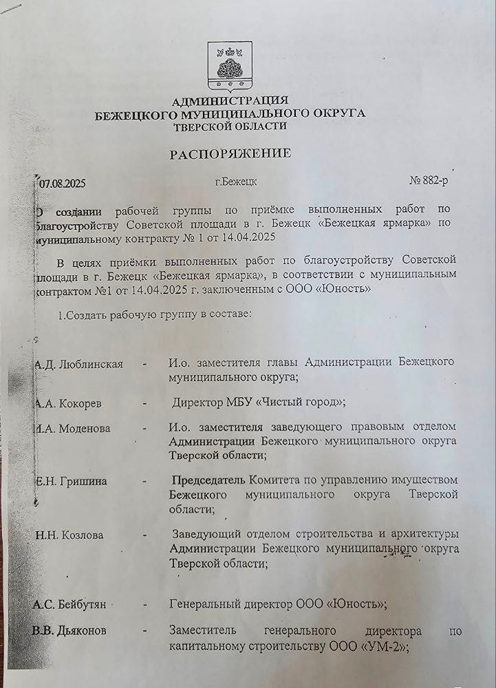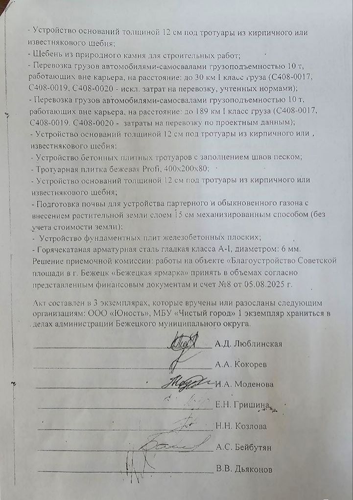 Выше опубликовано распоряжение администрации №882-р от 7.08.2025 г. со списком рабочей группы о приёме выполненных работ и акт приёма выполненных работ от 11.08.2025 г.