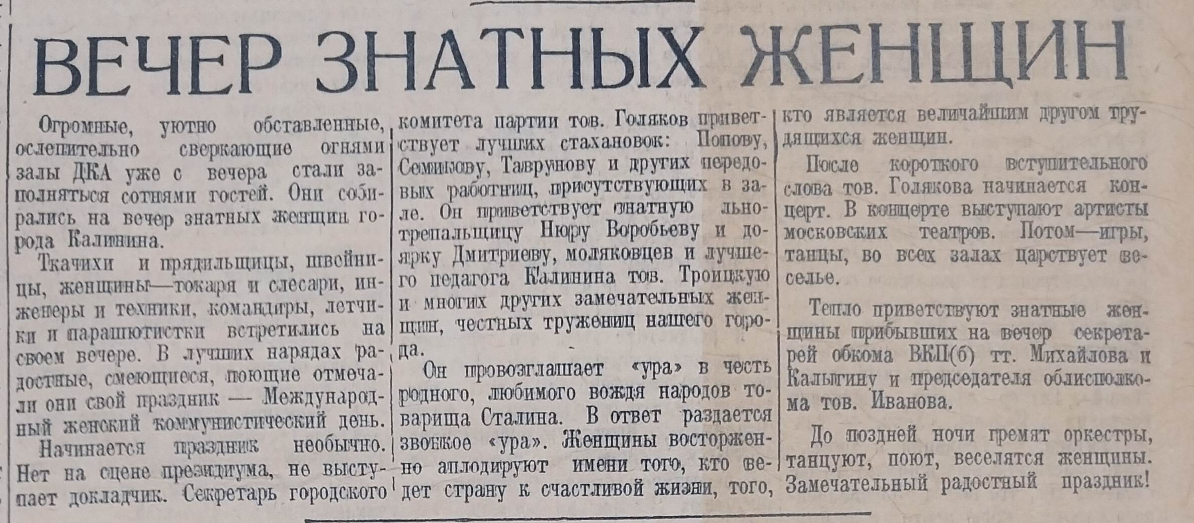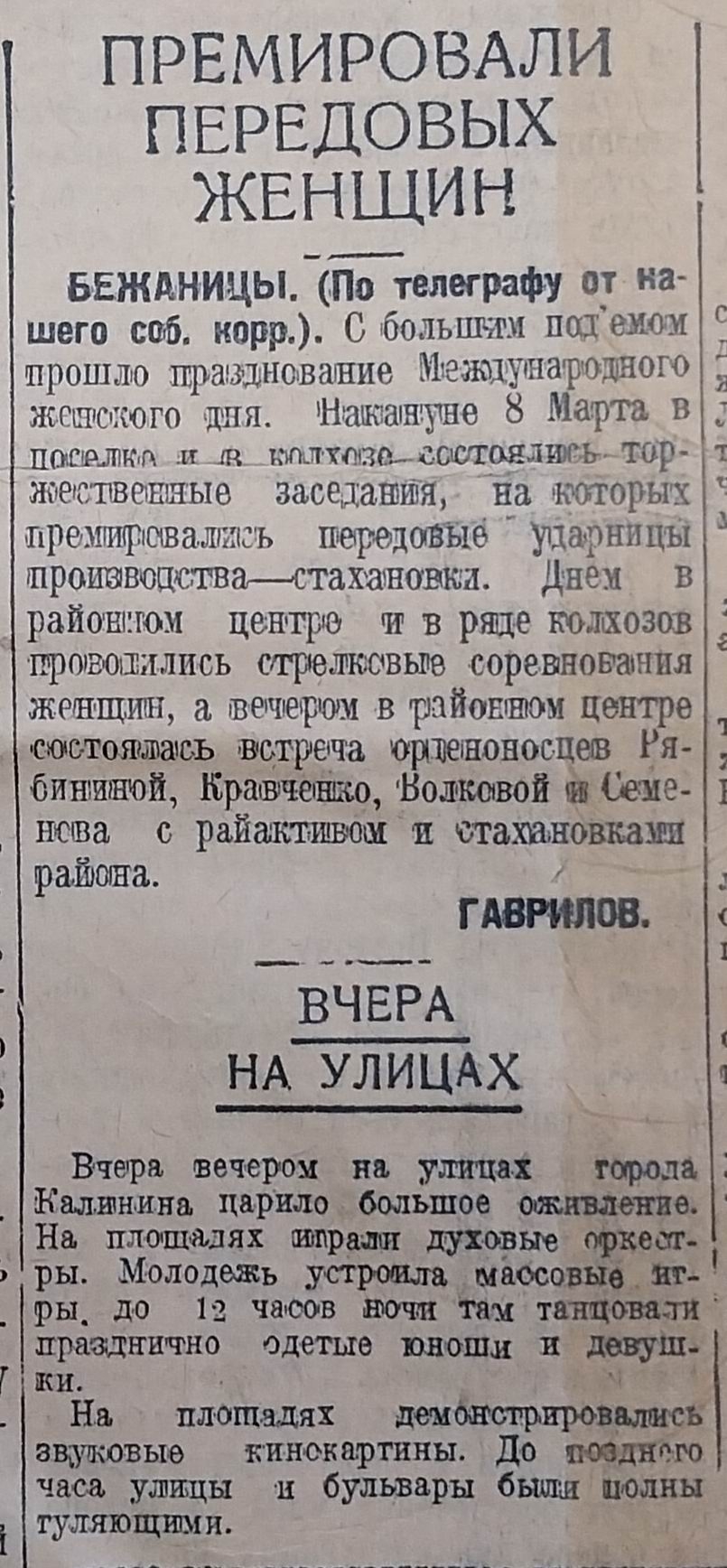 Как праздновали день 8 Марта в Калининской области 90 лет назад. Предлагаем вашему вниманию несколько газетных заметок из областной калининской газеты «Пролетарская правда», опубликованных 9 марта 1936 года.
