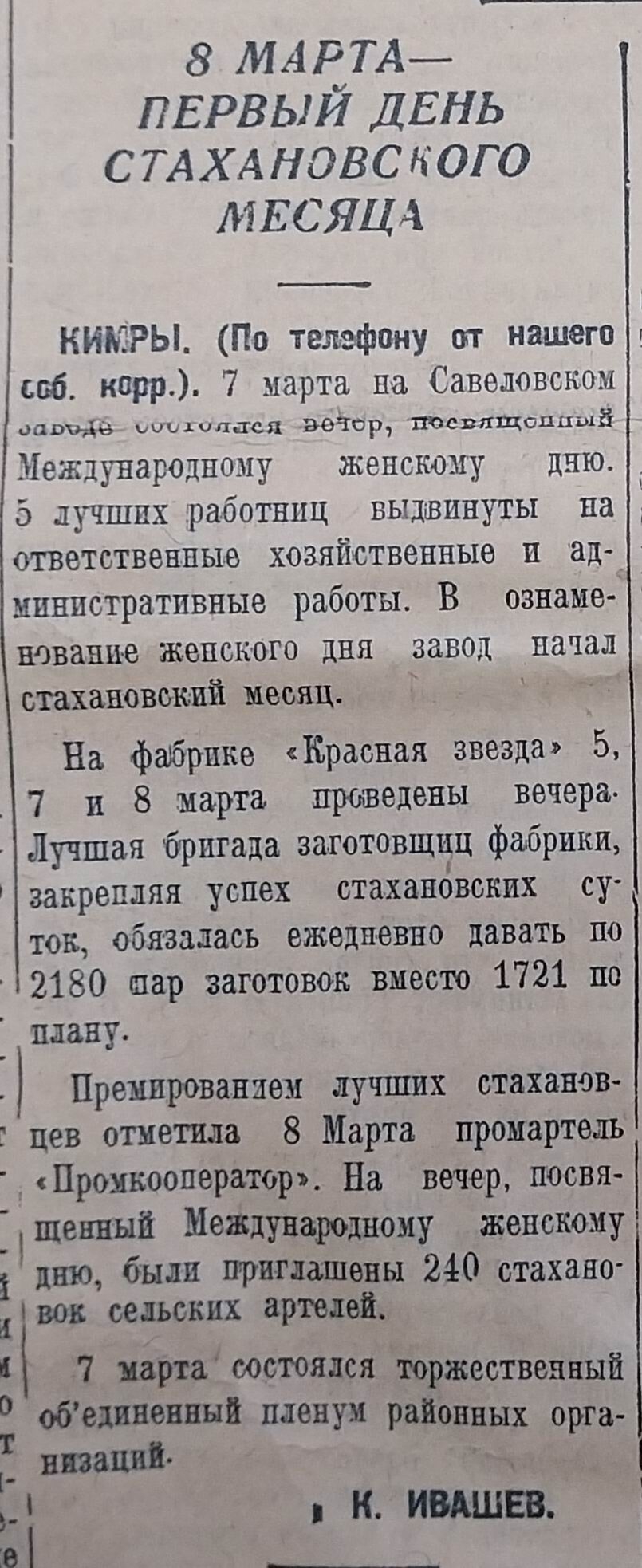 В Кимрах торжественные вечера, на которых чествовали лучших работниц, прошли на Савеловском заводе, фабрике «Красная звезда», в промартели «Промкооператор». А также прошел торжественный объединенный пленум районных организаций.