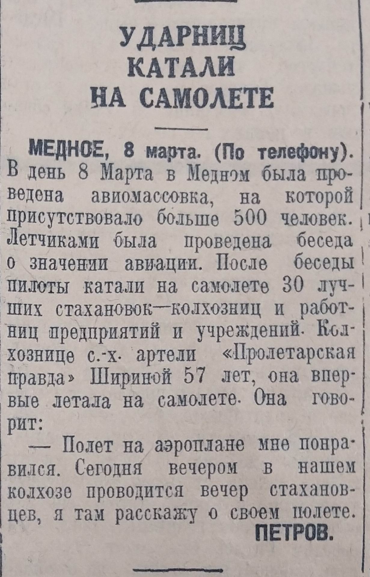 В Медном 8 марта была проведена авиамассовка с беседой о значении авиации, а 30 лучших колхозниц и работниц предприятий и учреждений катали на самолете.