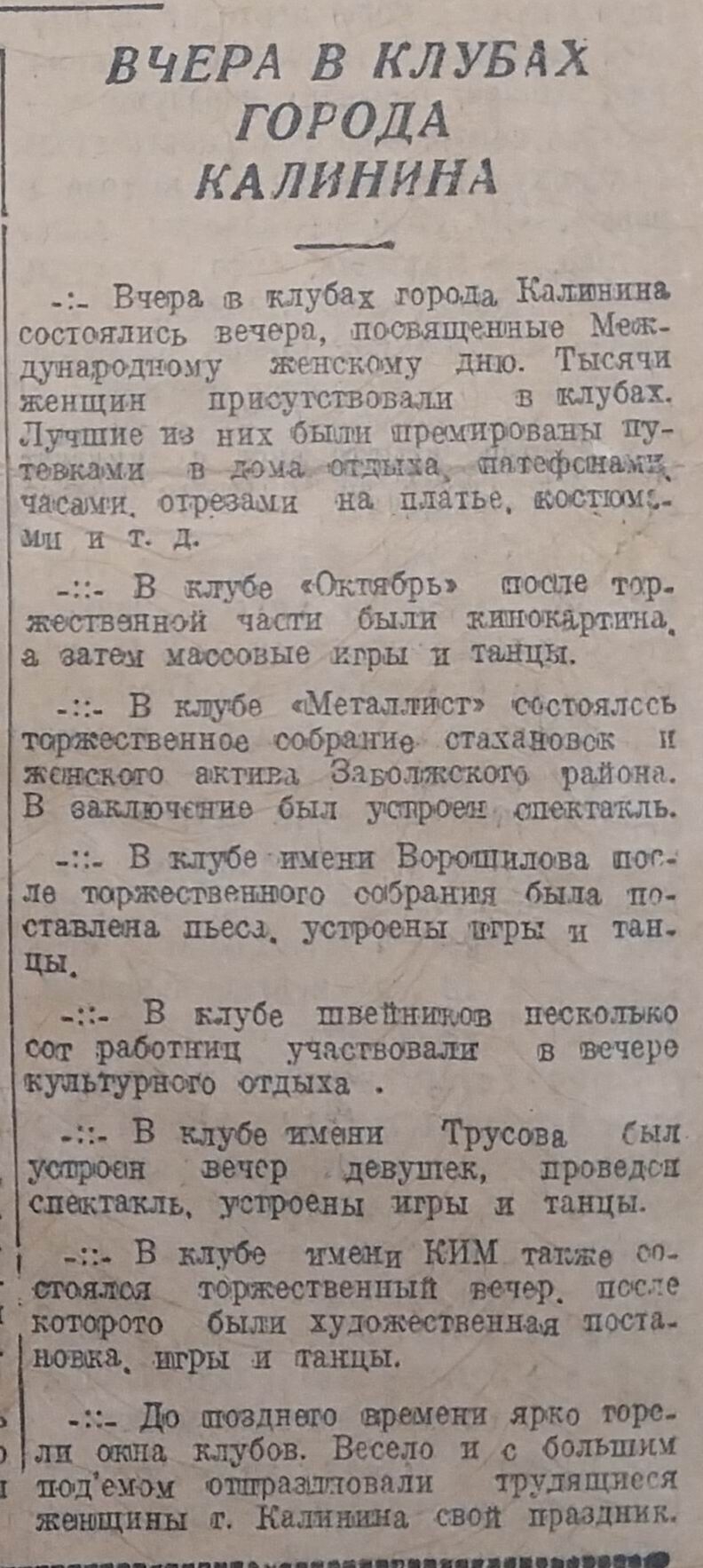 Во всех клубах города состоялись вечера, на которых присутствовали тысячи женщин. Лучшие из них были премированы путевками в дома отдыха, патефонами, часами, отрезами на платья и костюмы и др. После торжественной части в клубах прошли вечера отдыха, с показом кинокартин и спектаклей, танцами. Большое оживление отмечалось и на улицах города. На площадях демонстрировались кинокартины, улицы и бульвары были полны гуляющими.