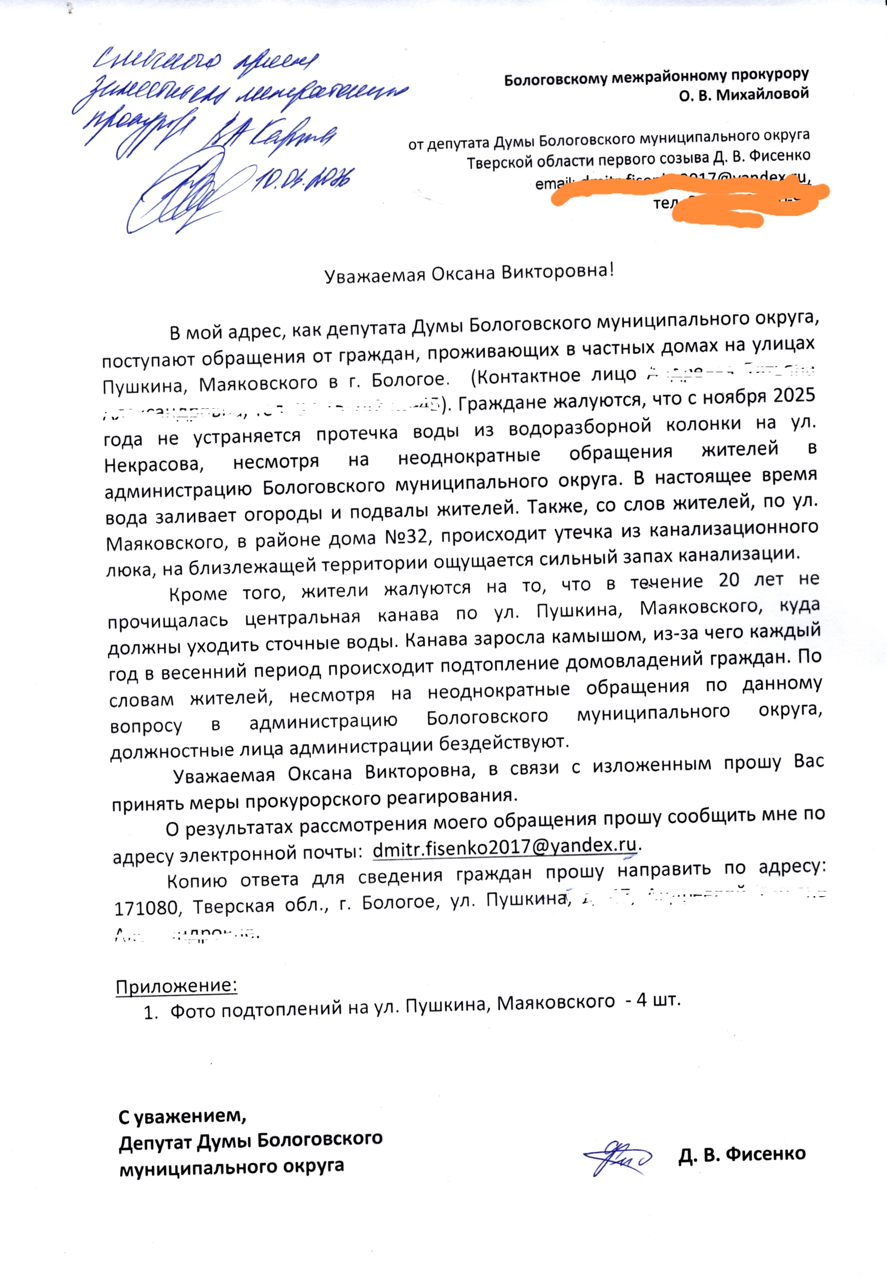 В адрес депутата Думы Бологовского муниципального округа Дмитрия Фисенко, поступают обращения от граждан, проживающих в частных домах на улицах Пушкина, Маяковского в г. Бологое. Граждане жалуются, что с ноября 2025 года не устраняется протечка воды из водоразборной колонки на ул. Некрасова, несмотря на неоднократные обращения жителей в администрацию Бологовского муниципального округа и прокуратуру. В настоящее время вода заливает огороды и подвалы жителей.