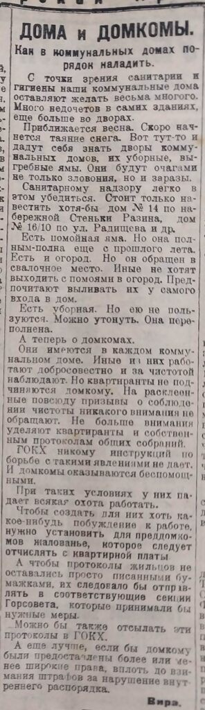 Номер газеты от 3 марта напоминал жителям города, что дворы коммунальных домов должны содержаться в чистоте. Поскольку в некоторых случаях эта проблема долго не решалась, предлагали активизировать работу домкомов путем назначения из квартирной платы жалования председателям домовых комитетов, введения штрафов, а протоколы собраний жильцов отправлять в Горсовет.