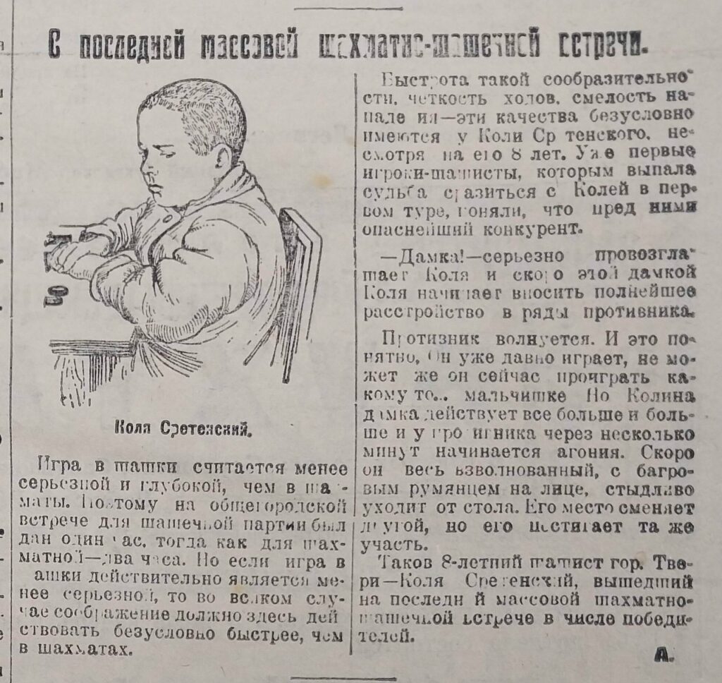 «Быстрота такой сообразительности, четкость ходов, смелость нападения – эти качества безусловно имеются у Коли Сретенского, несмотря на его 8 лет. Уже первые игроки-шашисты, которым выпала судьба сразиться с Колей в первом туре, поняли, что перед ними опаснейший конкурент. – Дамка! – серьезно провозглашает Коля и скоро этой дамкой Коля начинает вносить полнейшее расстройство в ряды противника», – писал корреспондент А. «Таков 8-летний шашист гор. Твери – Коля Сретенский, вышедший на последней массовой шахматно-шашечной встрече в числе победителей». Всего в турнире участвовало белее 250 человек. К сожалению, нет информации о том, сколько человек играло в шашки.